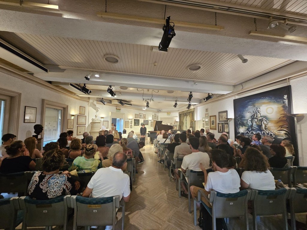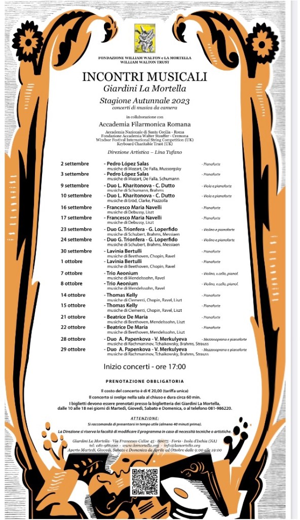 He is a very talented young pianist! The audience enjoyed so much his performances in both the concerts ( the Hall was full) that gave him a standing ovation. He has a very sharp musical intelligence, Mozart’s sonata was emotional and expressive , Fantasia baetica by De Falla was colorful and impressive and here his interpretation was really superbe. He played Mussorgsky ‘s Pictures and Schumann’s Kreisleriana with great confidence. I liked him so much that I asked him to come back and play to La Mortella when he wants (may be before the Chopin competition, so that he can play in 2 concerts the whole Chopin programs?)