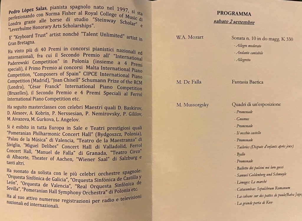 Caro Christopher, Pedro è stato davvero bravissimo, è un giovane pianista di grande talento! Ha tenuto 2 concerti in una sala piena e con un pubblico straordinariamente attento e caloroso che ha gradito moltissimo le sue esecuzioni tanto che gli ha tributato alla fine una standing ovation. È un pianista dotato di grande intelligenza musicale, attento ad ogni sfumatura e particolare della partitura, la sonata di Mozart davvero ammirevole per equilibrio ed espressività, mai leziosa, una straordinaria Fantasia baetica di De Falla, dove davvero ha dato il meglio di se’ con una esecuzione appassionata e piena di colori. Belle le interpretazioni dei Quadri di Mussorgsky e della Kreisleriana di Schumann, 2 monumenti della letteratura pianistica affrontati con grande sicurezza . Mi è talmente piaciuto che l’ho invitato a ritornare alla Mortella quando vorrà! Grazie per avercelo segnalato, mancavi solo tu! Ti aspettiamo per Thomas Kelly.