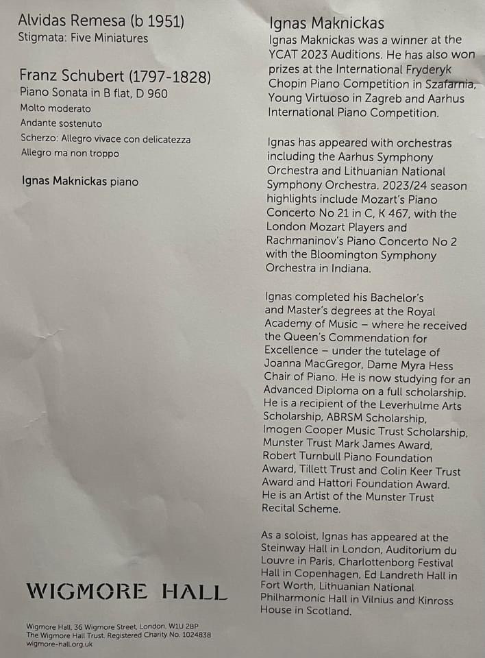 Ignas came out triumphantly …….But no it was Schubert that came out triumphantly – Ignas was simply the medium between us and the composer!There can be no greater compliment than that for a debut recital!