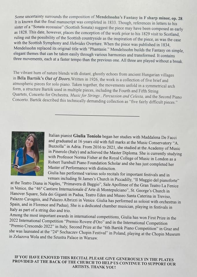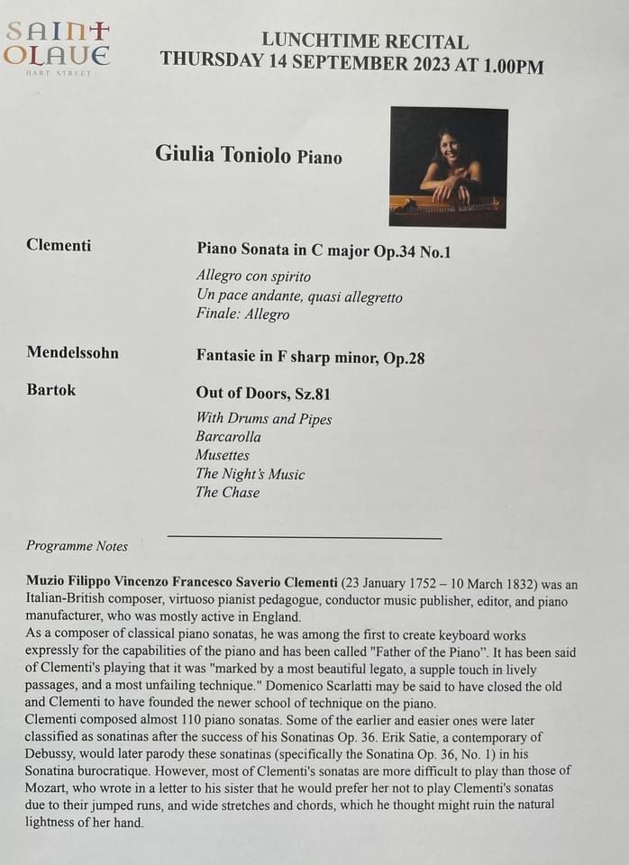 Some superb musicianly playing from Giulia Toniolo as you might expect from the class of Norma Fisher and Maddalena De Facci.St Olave’s an oasis of peace amongst the ever changing landscape that now surrounds the Tower of London.