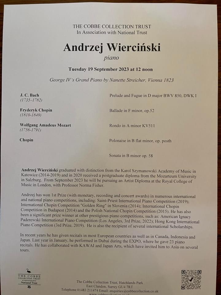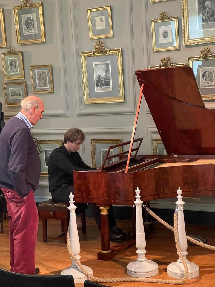 A triumph at Hatchlands but it was Chopin’s Erard that stole Andrzej heart before his concert on George IVs remarkable 1823 Streicher Viennese piano.A piano beautifully restored and it was Alec Cobbe who explained to Andrzej how to drive it .Six pedals needs some working out.Fazioli now has four pedals and if playing with an I pad you can add another two which equals six.But this piano was built two hundred years ago when there were certainly no I pads and pedals had a completely different meaning and usage.