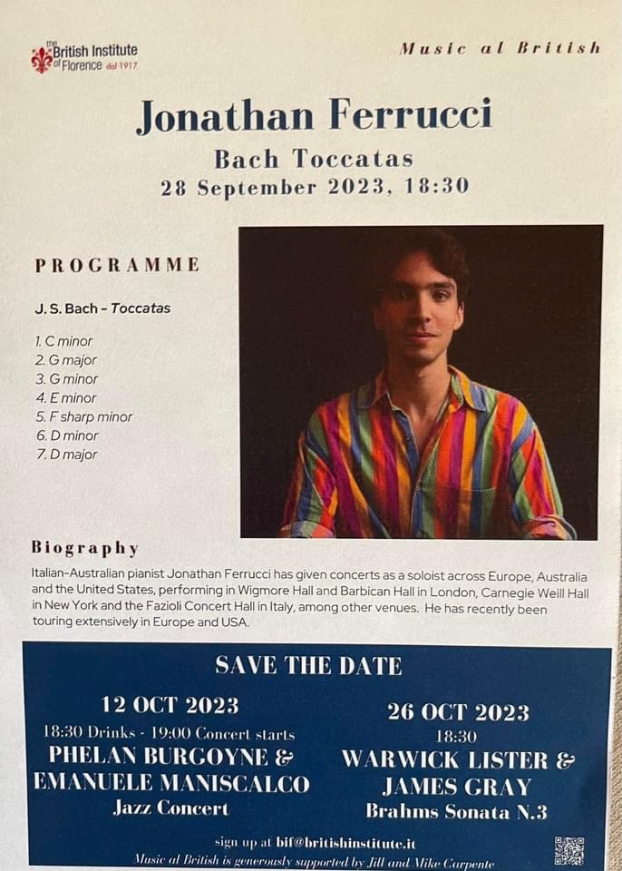 Jonathan Ferrucci is back in his home city of Florence, with the seven Toccatas by Bach,in the Harold Acton library now part of the British Institute.