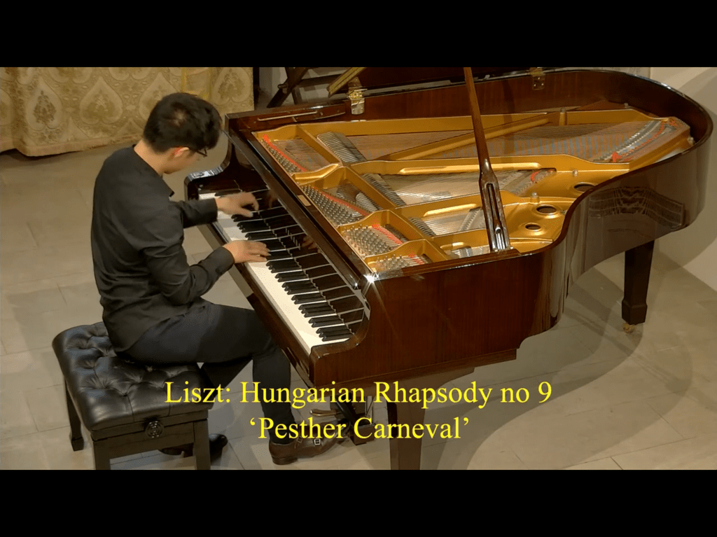 Hungarian Rhapsody No. 9, S.244/9in E flat , is the ninth .It is nicknamed the “Carnival in Pest” or “Pesther Carneval” and was composed in 1847. Liszt also made versions of the piece for piano four hands and for piano, violin, and cello.Liszt used five themes in this rhapsody. The first of these, possibly Italian in origin, can be found in one Liszt’s manuscript notebooks. The second theme is a csardas by an unknown composer. After the third theme, which is an unidentified folk tune, Liszt quotes an authentic Hungarian folk song, A kertmegi káposzta. The final theme quoted is a third folk tune, Mikor én még legény voltam.The Hungarian Rhapsodies, S.244 R.106 are a set of 19 pieces based on Hungarian folk themes and were composed during 1846–1853, and later in 1882 and 1885. In their original piano form, the Hungarian Rhapsodies are noted for their difficultyLiszt incorporated many themes he had heard in his native western Hungary and which he believed to be folk music, though many were in fact tunes written by members of the Hungarian upper middle class, or by composers such as Jozsef Kossovits often played by Roma (Gypsy) bands. The large scale structure of each was influenced by the verbunkos,a Hungarian dance in several parts, each with a different tempo Within this structure, Liszt preserved the two main structural elements of typical Gypsy improvisation—the lassan (“slow”) and the friska (“fast”). At the same time, Liszt incorporated a number of effects unique to the sound of Gypsy bands, especially the pianistic equivalent of the cimbalon .He also makes much use of the Hungarian gypsy scale