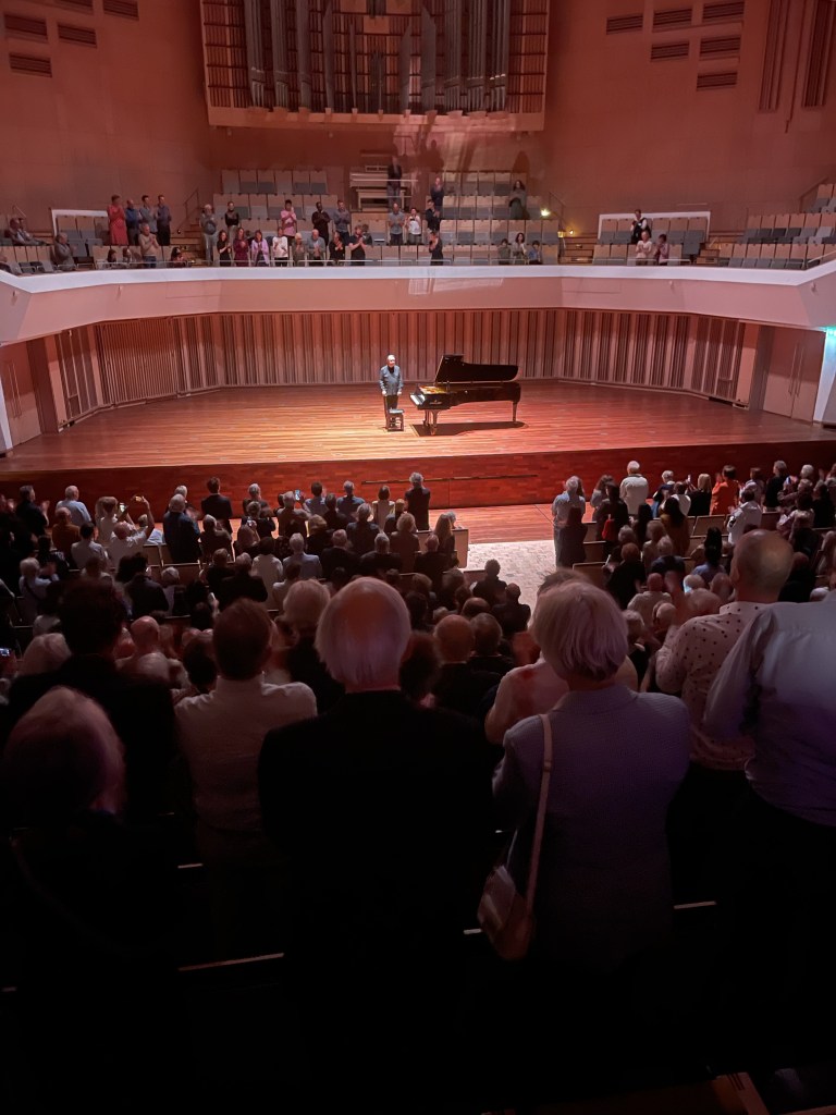 A monumental performance of Mussorgsky played like the great musician he is.Demonstrated immediately by the legato and shape he gave to the opening Promenade. Each of the ten pictures was shaped with astonishing characterisation as he lived so intensely each piece finding a chameleonic sense of colour and shape to each one. ‘Gnomus’ rudely interrupted the promenade where his orchestral feel for the octaves in’ Poco meno mosso pesante’ meant that he could bring out the bass which gave great depth to the sound in which each of the octaves were made up of individual sounds.The terrifying left hand trills were but vibrations leading to a final cry and a mad rush for shelter.Extraordinary virtuosity made for an easy escape ‘velocissimo con tutta forza’.’The old castle’was allowed to flow with great intensity and the highlighting of inner harmonies gave great depth and richness to the sound.’Tuileries’ was played with enviable jeux perlé and beguiling capriciousness.Rumbustuous ‘Bydlo’ suddenly took to the stage but with a beautiful sense of phrasing and colouring and the final appearance in the tenor register was of quite ravishing beauty.A Promenade made in heaven was only interrupted by the frenzied activity of the ‘Ballet and cackling of unhatched chicks’.The trills of the trio were played with irresistible energy before ‘Samuel Goldenberg’ entered the scene with nobility and authority ,Schmuyle’s beautiful pleadings were mere vibrations of sound before Goldenberg gave us full blast in the bass leading to the rather forlorn addieu of Schmuyle with the final word,of course , to Goldenberg. There was extraordinary dexterity in the ‘Market Place of Limoges’ with some transcendental playing of mastery and musicianship.It was a revelation of how the notes were allowed to vibrate in Catacombae – one could literally feel the beats as he played with real weight and not just hardness- delving deep into the notes where true secrets lie for those that can find them.’Con mortuis’ entered in a whisper with the left hand melody so beautifully and sensitively shaped.A breathtaking savagery to ‘Baba Yaga’ played with relentless energy with the beautiful orchestral oasis of the Andante mosso and the streaks of lightening that heralded the return of the demonic ‘Baba Yaga’.’The Great Gate of Kiev’ was played with aristocratic control with the opening statement only forte leaving enough space for the fortissimo vibrations of E flat later.Control,passion and aristocratic good taste gave the final bars a weight and timely significance for the true Gateway to Freedom.