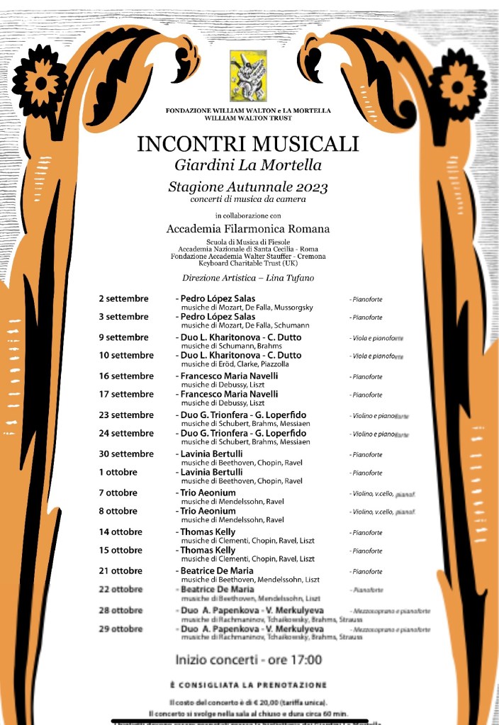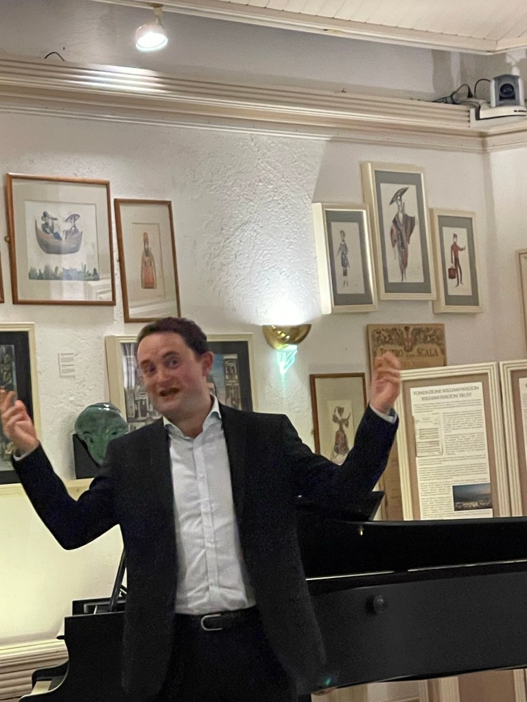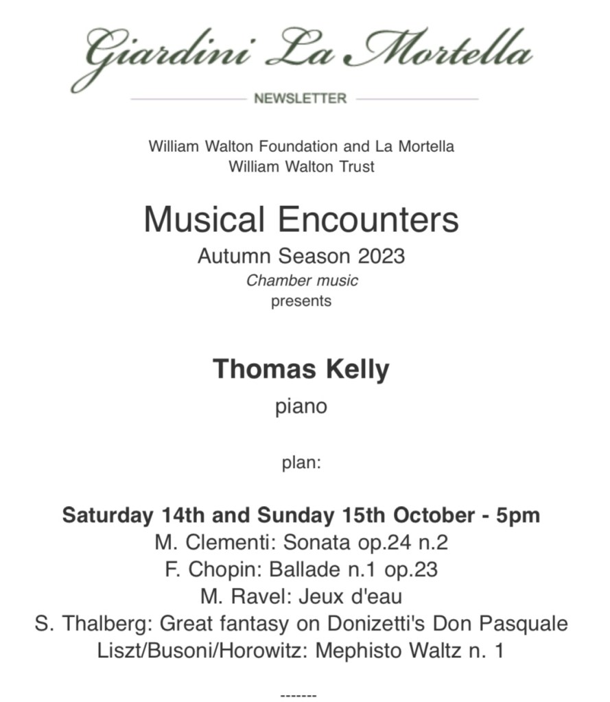 The resting place of Sir William and in the shadow of the big rock that contain his ashes ,that of his wife Susana .Lady Walton died in 2010 almost 25 years after her beloved husband and who,in his memory,their wishes she was so magnificently able to fulfill.Susana ever vigilant One of Clementi’s 110 Sonatas op 24 n.2 the one that was to inspire Mozart in his last opera ‘The Magic Flute’. It was played not only with the rhythmic brilliance of Clementi’s seemingly endless stream of notes but above all there was the elegance and sense of style of an inquisitive musical mind,with the same kaleidoscopic change of colour of looking through a prism.A grandiose opening of the ‘Andante’ that was indeed quasi ‘Allegretto’ with cascades of notes that were jewels glistening as they were shaped with a beguiling sense of elegance and style.The tongue in cheek after thought of the coda was thrown off with disarming nonchalance There was a remarkable ease with which notes became just streams of brilliant sounds in the Rondo ‘Assai Allegro’ ‘They could not be called jeux perlé because they were imbued with a driving energy that brought this much neglected sonata to a brilliant conclusion.There was a subdued opening to Chopin’s much abused First Ballade.Bathed in a long held pedal that had me searching the score to see if it was Chopin’s own very precise indication.The pedalling in Chopin,so often overlooked,gives us a precious insight into the sounds and shapes that Chopin wanted from his long Bel canto outpourings.Not sure if it was Chopin or Tom’s great sensitivity to sound that immediately turned this opening into a magic wand opening the flood gates to Chopin’s ravishingly beautiful long cantilenas.A subtle melodic line that was allowed to take flight with a ravishing sense of balance and delicacy.Leading to the first passionate outpouring that was shaped with sumptuous beauty and subtle phrasing that put this much maligned Ballade back where it belongs as one of the most original and beautiful early works of an innovative poetic genius of the piano.The jeux perlé that followed produced gleaming sounds rising and falling with a remarkable control that never lost sight of the music or allowed it to veer out of control as it so often does in the hands of so called ‘virtuosi’. A coda shaped like the true musician that Tom is but also played with the excitement and exhilaration of a Horowitz who like Liszt was also the greatest showman on earth too. Floristan and Eusebius are nothing compared to this ‘Devil and the deep blue sea’ approach from artists of such diabolical temperament.There was beauty and fluidity that Tom brought to Ravel’s ‘Jeux d’eau’ with an etherial sound of gossamer finesse and refined virtuosity.The curtain had now risen on Thalberg’s remarkable Grande Fantaisie on Donizetti’s Don Pasquale. Great drama and fantastic contrasts between legato and staccato with Thalberg – Liszt’s only true rival – showing us that the piano was also the greatest orchestra on earth capable of all the colours and sounds of the grandest of ensembles .Beguiling sounds seemingly appearing in every corner of the keyboard via a transcendental display of piano trickery of a different age.An age when technical mastery meant a chameleonic sense of colour each note containing a hundred gradations of sound and not just breaking the speed limit! Unbelievable the tumbling octave accompaniment over the entire keyboard whilst the melodic line was so perfectly shaped in the central most beautiful register of the piano. No wonder people of the day thought that Thalberg like Liszt and Paganini had made a pact with the devil to be given another couple of arms and hands.An amazing display of virtuosity in the true meaning of the word ,that of a complete mastery. It is Art that conceals Art as sumptuous sounds were allowed to erupt from this box of mere hammers and strings. Of course as Anton Rubinstein pointed out the pedal,a relatively new invention in their day ,is the real soul of the piano, and it is this that allows the illusion that a percussive instrument of hammers that hit the strings can appear to sing better than any Bel Canto nightingale of the day.There was a slow very deliberate opening to Liszt’s demonic Mephistophelian Waltz n.1 where even the opening octaves were played in a subdued melodic way with each one made up of four notes of different weight.This of course just opened the flood gates to a display of astonishing bravura of noble style and excitement. Horowitz,described on his first appearance in Paris,as the greatest pianist alive or dead,just added more colour and hysteria with the occasional added bass notes and padding out of chords.A filling out of embellishments too and adding double notes to Liszt’s already impossible antics. Bursting into red hot flames at the end where the showman Horowitz added octaves and all sorts of trickery that I am sure Liszt himself might have done given the evolution of the Steinway as opposed to its predecessor the Erard that was Liszt’s preferred instrument of the day. A spontaneous standing ovation reminded me of the stories in history books of aristocratic ladies in the Paris salons turning into hysterical animals trying to get as near as they dare to their conquering hero. A much more refined audience at La Mortella but they did manage to persuade Tom to play just one little piece before retiring. La Campanella by Liszt and his pupil Busoni produced even more phenomenal feats of subtle virtuosity that were breathtaking in their daring and refined beauty.Turning a pianistic showpiece into the tone poem that the Poet Liszt had intended with the same funabulistic virtuosity of Paganini translated by a Genius into a ravishingly beguiling show piece that like Paganini was only fit for a King.Alessandra Vinciguerra, Susana’s dedicated second in command and now Director of La Mortella .Fulfilling the Wal
