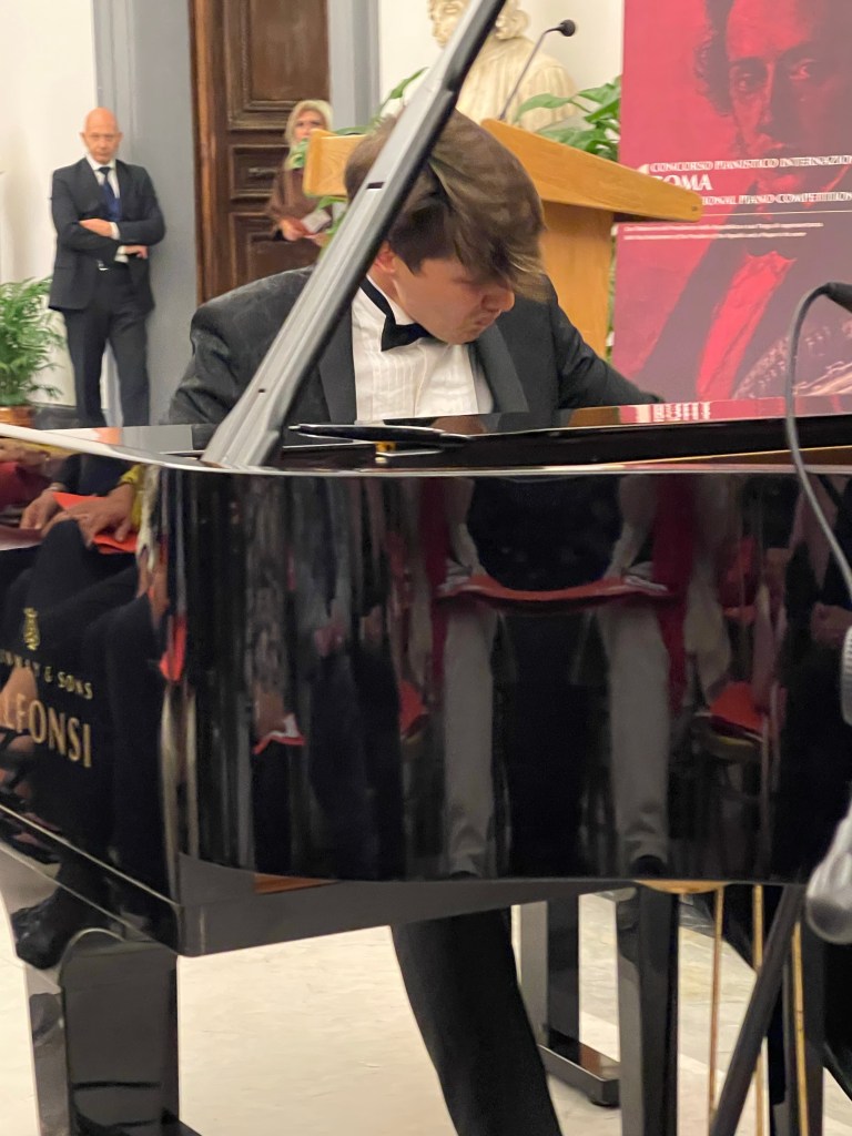 Artists are born not made .They can be nurtured and even destroyed but that magic thing that some may call soul is something that grows within by a personality that chooses what to take and what to leave .It was Curzon,though,who wisely said that to be a great pianist is 90% work and 10% God given talent. It was just the right setting then with Marcus Aurelius bestriding his stallion in the capital of Rome for a young man that Marcella Crudeli had realised his talent since his teens and was happy to introduce him to her public at the presentation of her International Piano Competition next month. Now only just 24 and obviously realising what a responsibility his talent is,he has finally dedicated all the hours needed to allow his talent to flourish and take wing . And take wing it certainly did today! An unbelievable transformation as we saw before us the birth of a great artist with an artistic personality and temperament that left me bewitched ,bothered and bewildered .