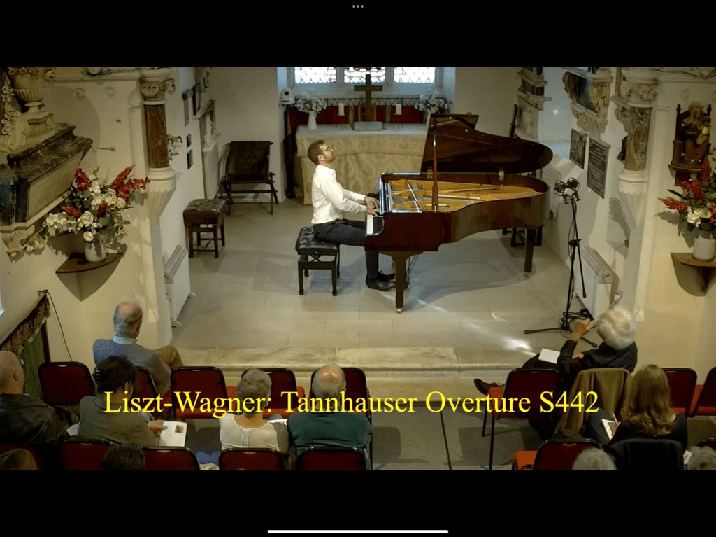 Luminosity and purity of sound poured from Filippo’s hands as Debussy’s extraordinary bells were allowed to be seen in the distance coming closer and closer with joyous intensity.Playing of extraordinary sensitivity and with the mystery and revelation of the moon shining brightly in the desolate landscape that Filippo was able to create with mastery and imagination.The Golden Fish was played with a clarity and aristocratic simplicity as the piano was awash with sounds of great fluidity and disarming beauty. Filippo is becoming quite an authority on the relationship between Liszt and his son in law Wagner.Having recorded one CD of the transcriptions there is another in the pipe line which will include the Tannhauser Overture that astonished and overwhelmed us today. I had heard him play it it in Italy on a piano that Liszt would have used – an Erard of 1876- but today on this modern grand piano it was even more overwhelming for the volume of sound and the pianistic invention of bringing the full Wagner orchestra onto a single instrument.A tour de force from Filippo who was visibly exhausted after such a marathon of athleticism full of excitement and exultation.It was above all a tour de force of invention that would have put Liszt’s rival Thalberg to shame as Liszt was able to literally bring the score to life on a single instrument. Filippo had been to Bayreuth last summer having been awarded the prestigious Bayreuth Festspiele Scholarship and had been able to hear all four hours of Parsifal in the theatre where it was born.The Solemn March is a paraphrase of great suggestion of brooding insistence full of colour and radiance and lead straight into the nobility of the brass at the opening of Tannhauser.Two remarkable performances of Wagner /Liszt from a young man who is dedicating his time to a deep study of this extraordinary world and recording many of his finds venturing into a world that only Leslie Howard has dared pioneer before him.