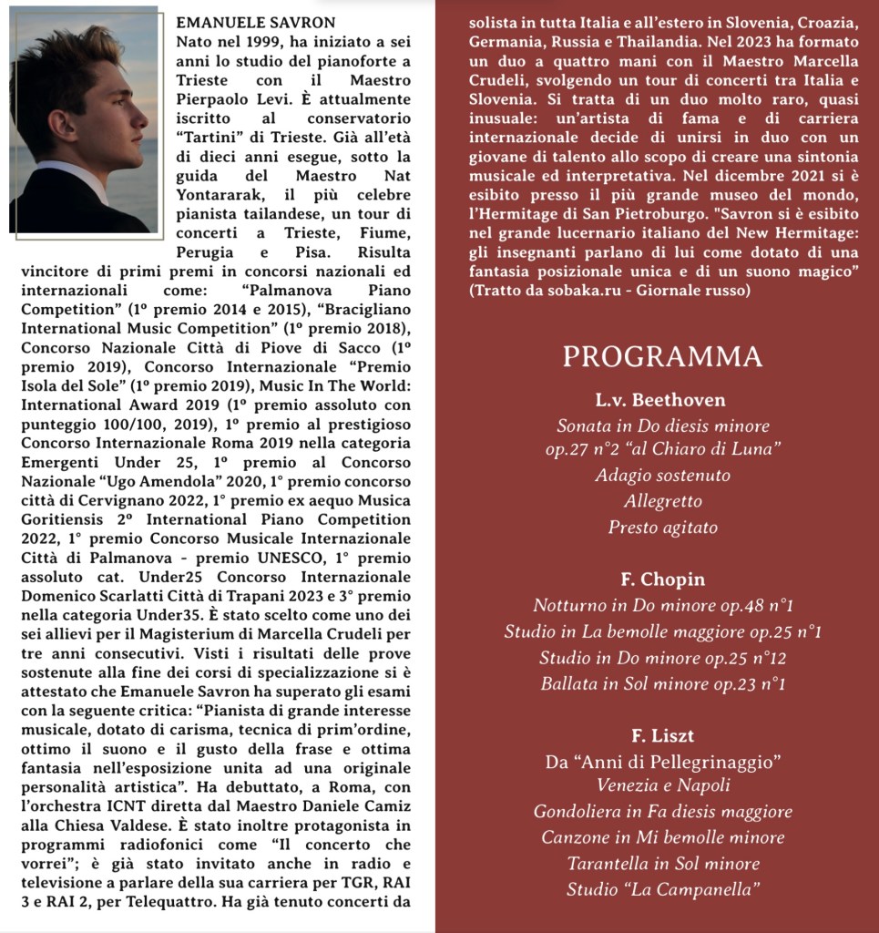 Born in Verona in 1998, Giovanni earned his Bachelor’s Degree from “B. Marcello” Conservatory of Music in Venice and then decided to continue his piano studies with Epifanio Comis at “V. Bellini” State Institute of Music in Catania, where he obtained his Master’s Degree in Piano Performance and in Chamber Music with top honours.