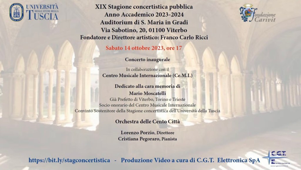 dell’Università degli Studi della Tuscia riprende l’attività inaugurando la XIX Edizione 2023-2024 sabato 14 ottobre 2023, alle 17. Come sempre i concerti si terranno nell’Auditorium di S. Maria in Gradi.