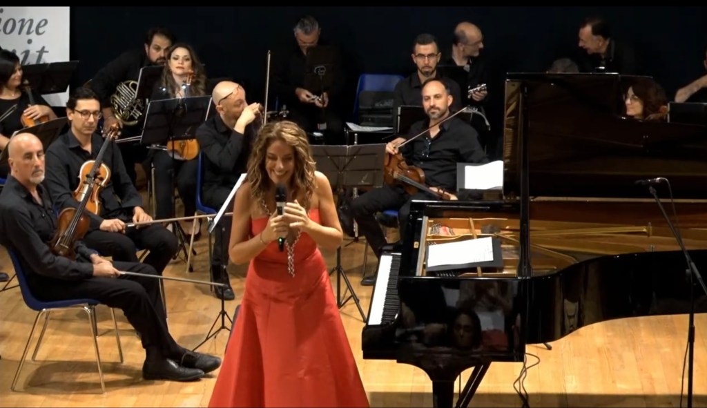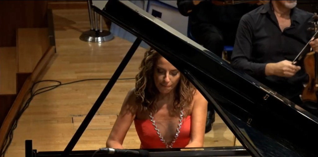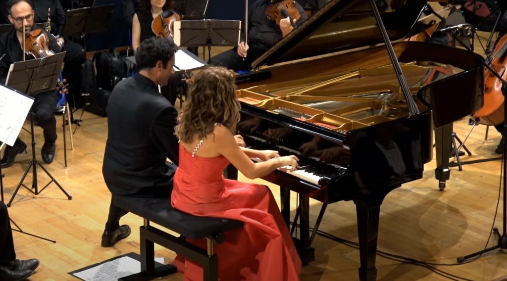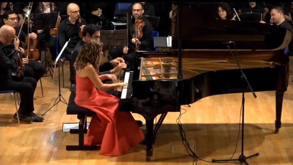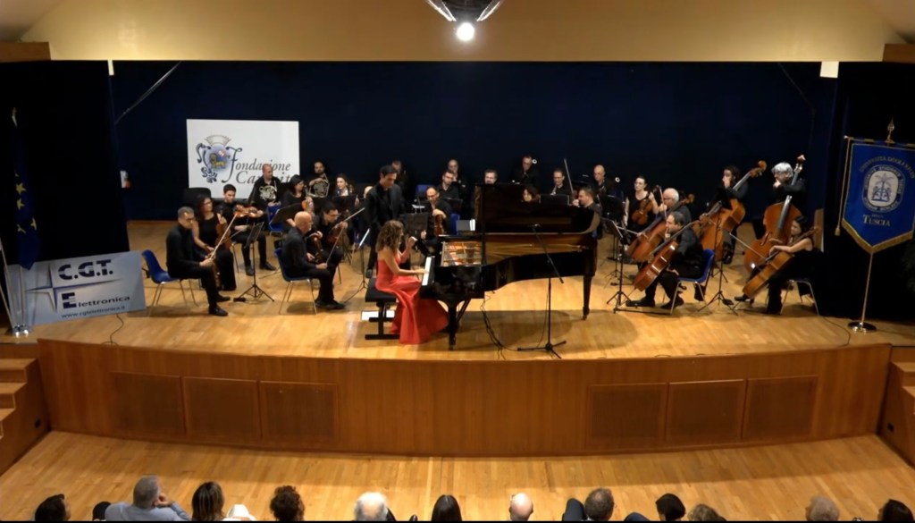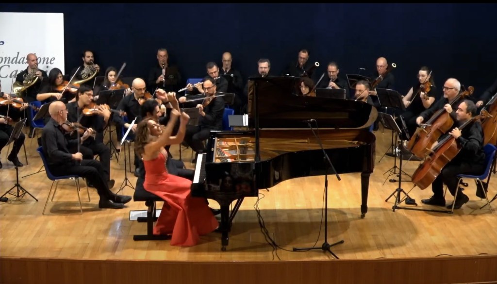 The ‘Adagio’ reached moments of sublime beauty with the piano and orchestra playing with equal sensitivity.A real duet in which the simple unadorned notes of the piano shone like jewels as the strings merely plucked their instruments with the wind providing the warmth of the harmonic invention.Cristiana happy to play Mozart’s notes without any of the ornamentation that we are plagued with these days in the name of authenticity.What a relief it was to hear this truly sublime simplicity!There was an infectious ‘joie de vivre’ to the ‘Allegro assai’ with virtuoso bassoon playing too replying to the pianists left hand with great technical skill and artistry.Cristiana with Lorenzo managed to purvey their obvious enjoyment at making music together in a continual joyous conversation between the piano and orchestra.An ovation from the audience at this opening concert of the season and it was now time to share one of Cristiana’s own compositions with an audience demanding more.’