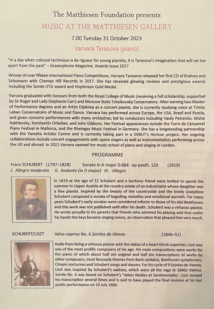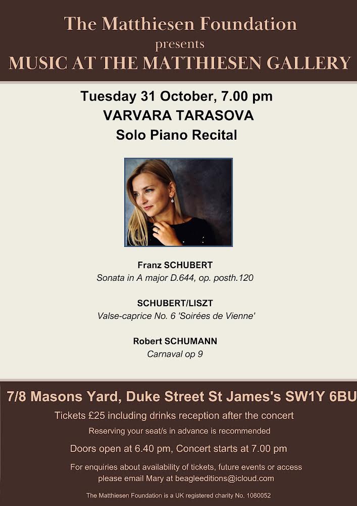In the sumptuous Matthiesen Gallery in Mayfair Varvara Tarasova started her programme with the shortest but most mellifluous Sonata by Schubert of pure innocent beauty.