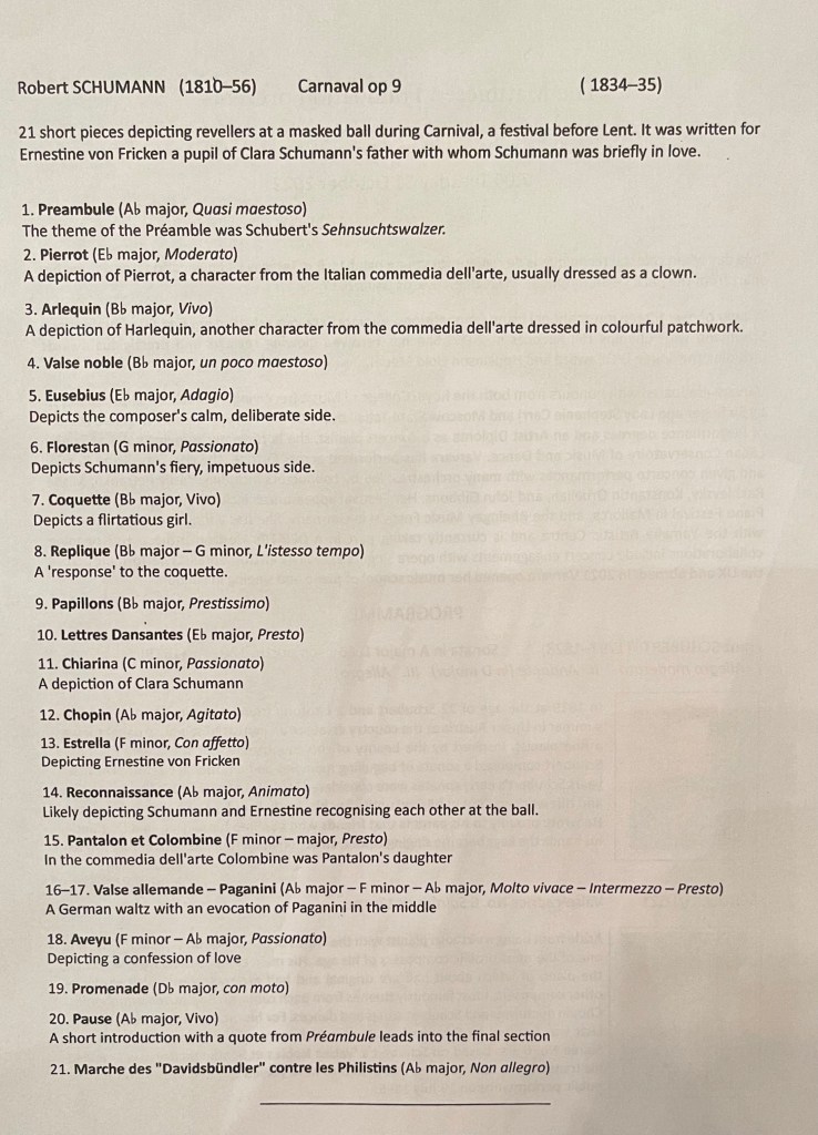 Schumann’s monumental Carnaval filled this rarified atmosphere with a parade of mignons aided and abetted by Schumann’s duel characters of Florestan and Eusebius.