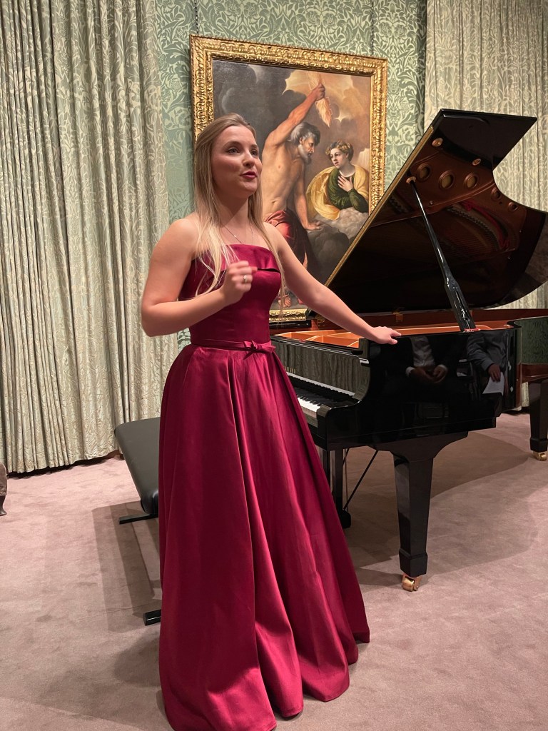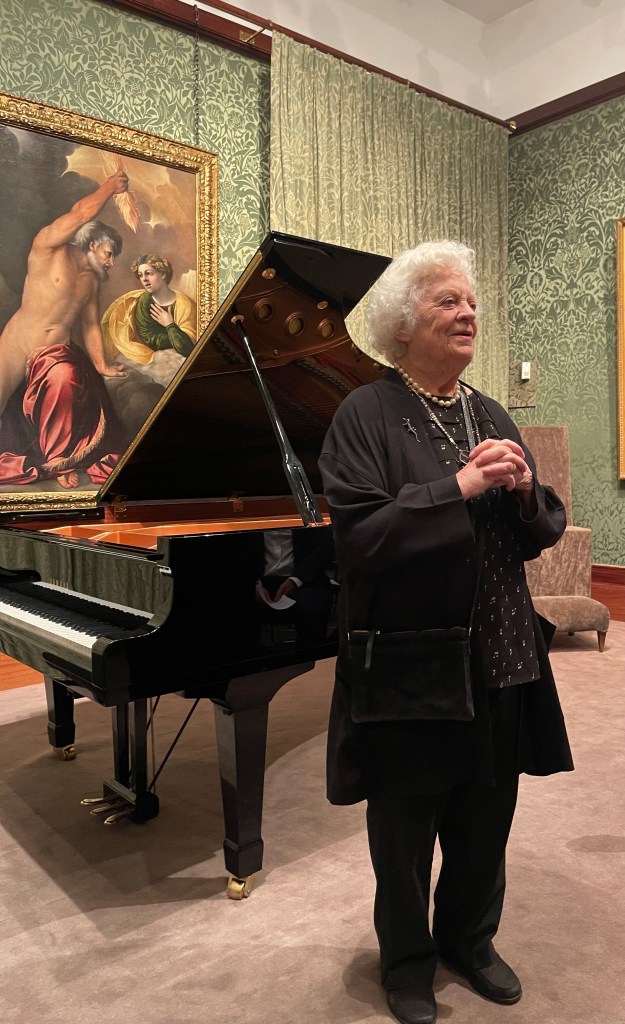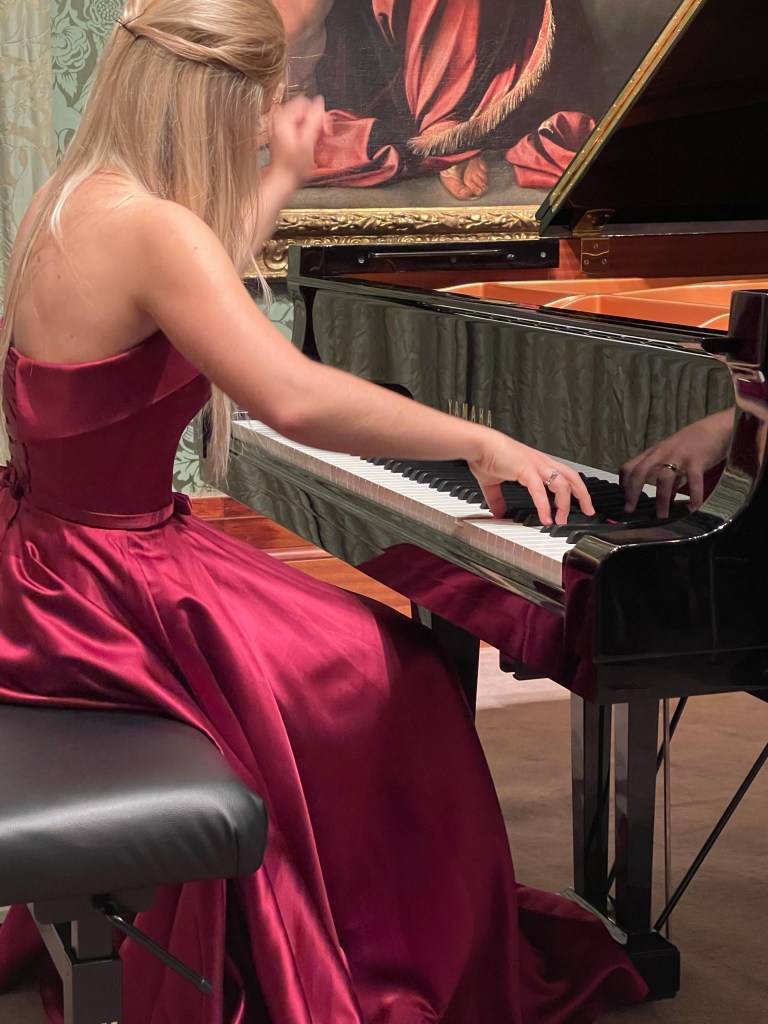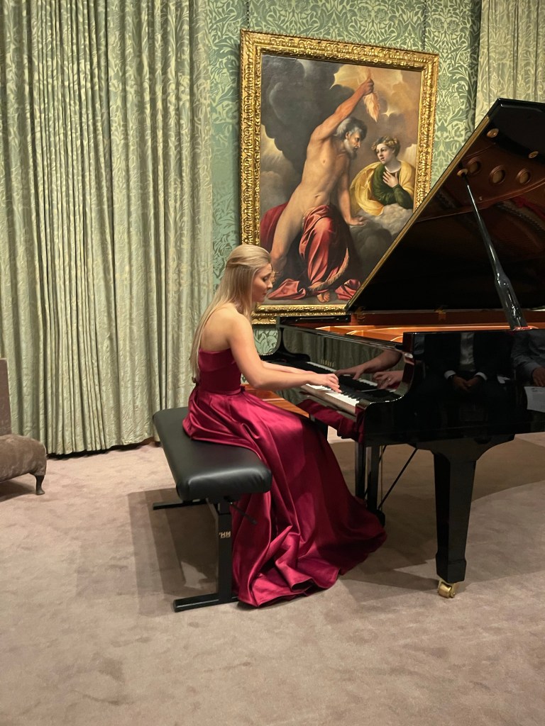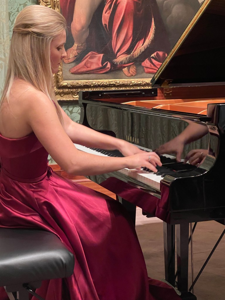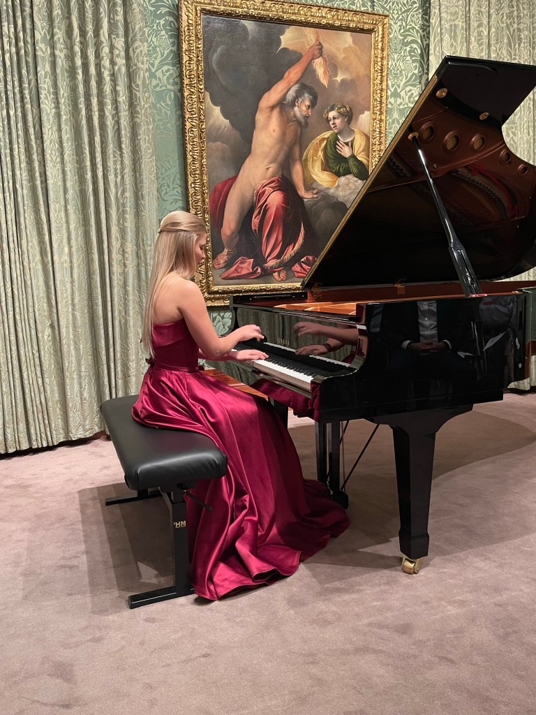 Beautiful music surrounded by magnificent paintings and played by a beautiful young pianist .