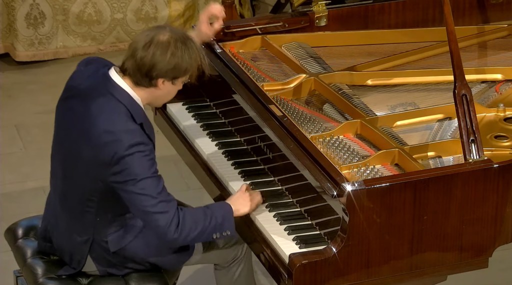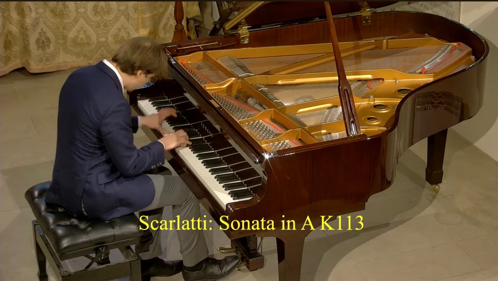 Haydn wouldn’t be Haydn if he didn’t send you away with a toe-tapping finale and such a movement ends this sonata. To that end, Haydn’s go-to rhythmic device is repeated notes, and this nale chatters on constantly at an 8th-note patter, interrupted at random, it would seem, by surprising silences and dramatic pauses – as if to allow the performer to turn sideways and wink at his audience.