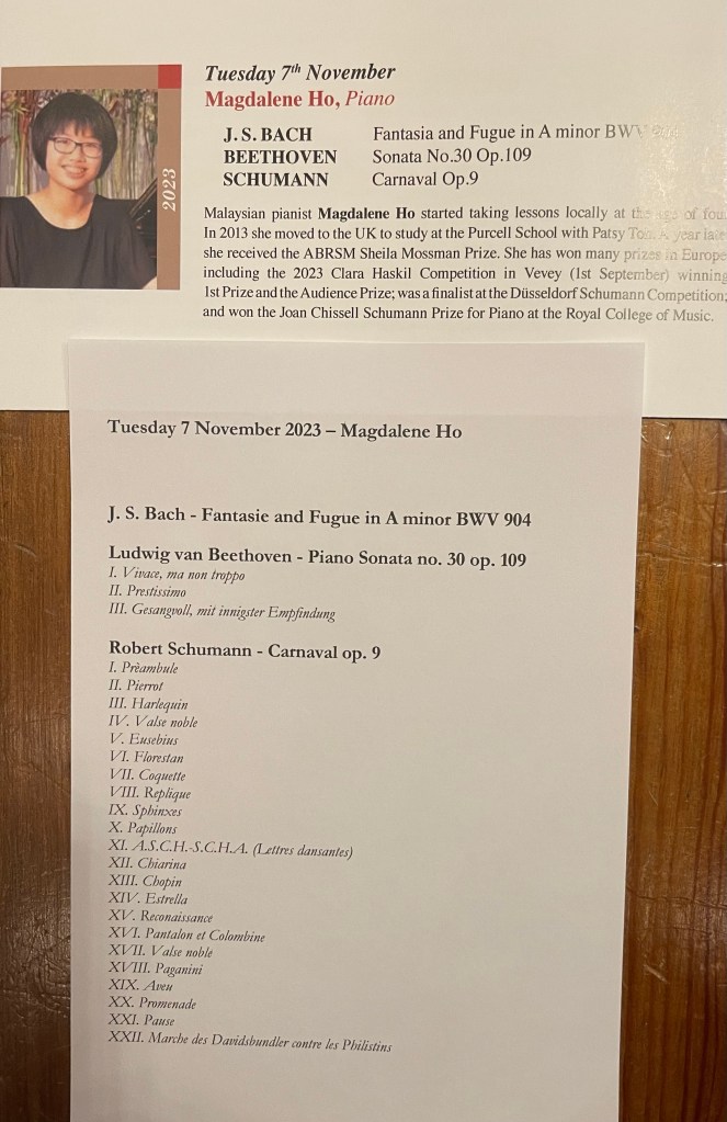 There was a great fluidity to Clara’s variations and there was the chordal simplicity of the second alternating with the slow harmonically varied third.Sumptuous beauty in the fourth with the theme in the tenor register surrounded by exquisite embellishments.The great drama in the octave variation with the pompous chordal declamation of the theme dissolved so beautifully into the delicately shadowed mellifluous theme.A ending of arpeggiando chords was spread over the keyboard with ravishing beauty.