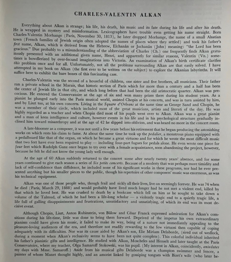 In 1848 Alkan was bitterly disappointed when the head of the Conservatoire,Auber,replaced his teacher the retiring Zimmerman with the mediocre Antoine Marmontel as head of the Conservatoire piano department, a position which Alkan had eagerly anticipated, and for which he had strongly lobbied with the support of Sand, Dumas, and many other leading figures.A disgusted Alkan described the appointment in a letter to Sand as “the most incredible, the most shameful nomination”;and Delacroix noted in his journal: “By his confrontation with Auber, [Alkan] has been very put out and will doubtless continue to be so.”The upset arising from this incident may account for Alkan’s reluctance to perform in public in the ensuing period. His withdrawal was also influenced by the death of Chopin; in 1850 he wrote to Masarnau “I have lost the strength to be of any economic or political use”, and lamented “the death of poor Chopin, another blow which I felt deeply.”Chopin, on his deathbed in 1849, had indicated his respect for Alkan by bequeathing him his unfinished work on a piano method, intending him to complete it , and after Chopin’s death a number of his students transferred to Alkan.After giving two concerts in 1853, Alkan withdrew, in spite of his fame and technical accomplishment, into virtual seclusion for some twenty years.For many years it was believed that Alkan met his death when a bookcase toppled over and fell on him as he reached for a volume of the Talmud from a high shelf.The story of the bookcase may have its roots in a legend told of Aryeh Leib ben Asher , rabbi of Metz,the town from which Alkan’s family originated.