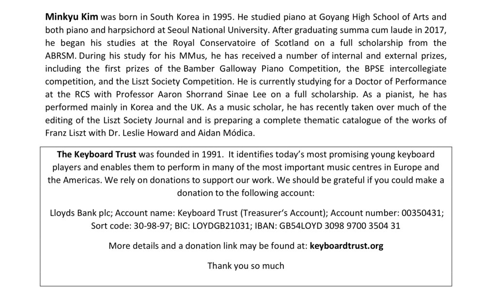 Minkyu Kim was born in South Korea in 1995. In 2017, he began his studies at the Royal Conservatoire of Scotland, where he is currently studying for a Doctor of Performance. Minkyu has performed piano concertos with the Scottish Ensemble and the Royal Scottish National Orchestra, and has had several chamber music concerts with Seoul National University Philharmonic Orchestra. He is a specialist in the sublime music of Franz Liszt