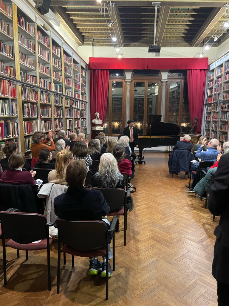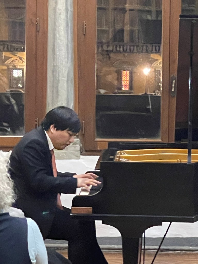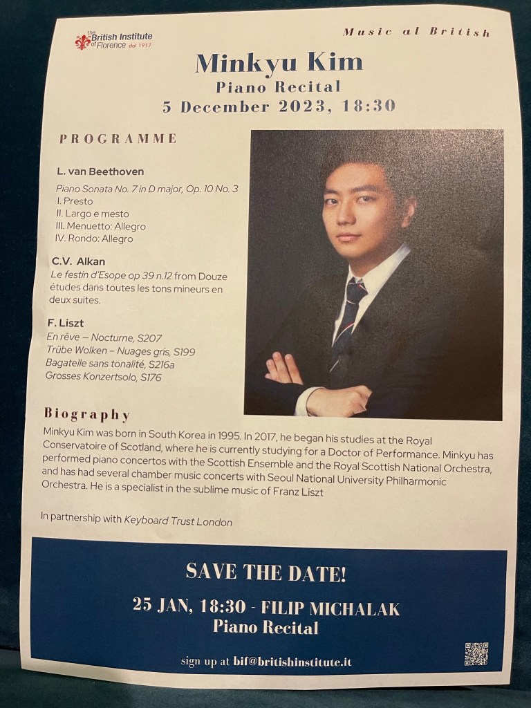 “Il penseroso” a poem and sculpture by Michelangelo that sits in the Medici Chapel that had inspired Liszt to write a piece for his ‘Years of Travel’ when he visited the city in 1838 .Minkyu had learnt it especially as a homage to Liszt and to Florence on this occasion …..an encore from an eclectic thinking musician and superb virtuoso pianist.It was fascinating to hear him explain the ‘preludes’ he had improvised between pieces as was the practice in the 18th Century to prepare the public for the next piece.And to know that the ‘prelude’ to the Grosses Konzertsolo was from the orchestral introduction of it that Liszt had insisted be played before his orchestral version (left unfinished by Liszt but completed and recorded by Leslie Howard )