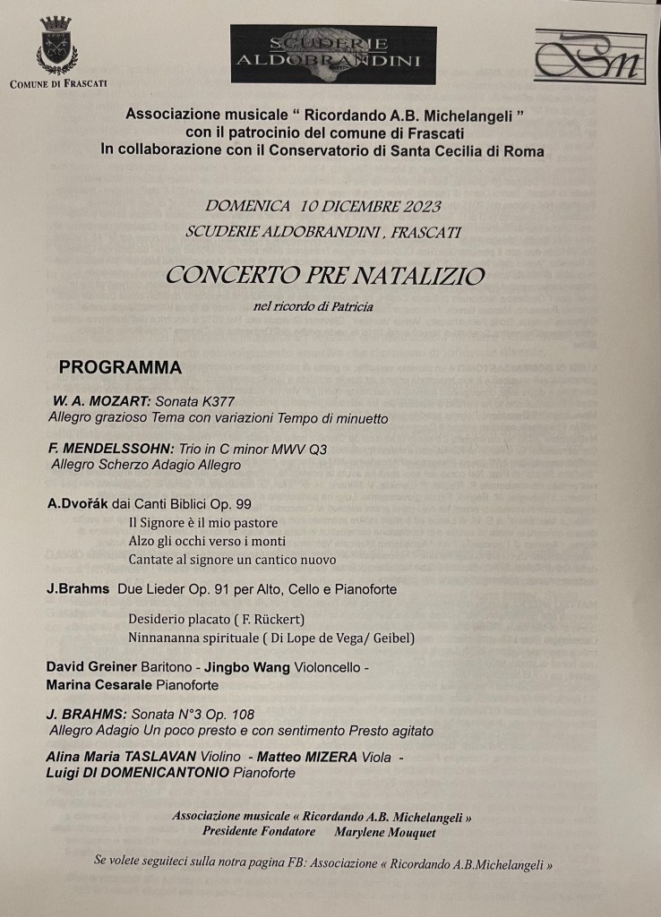 This year a chamber music concert with works for violin and piano by Mozart and Brahms .A trio by Mendelssohn with viola instead of cello and lieder by Dvorak and Brahms (with piano and cello).