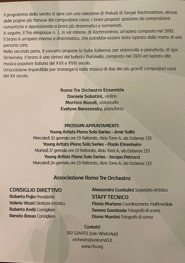 A seguire, il Trio élégiaque n. 1, in sol minore, di Rachmaninov, opera composta nel 1892. Il brano è un’opera intensa e drammatica, che potrebbe essere stata ispirata dalla morte di una persona cara.Nella seconda parte, il concerto propone la Suite Italienne, per violoncello e pianoforte, di Igor Stravinsky. Il brano è una sintesi del balletto “Pulcinella”, composto nel 1920 ed ispirato alla musica popolare italiana del XVII e XVIII secolo.