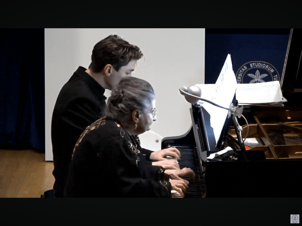 E’ stata per me una vera gioia suonare all’Università degli Studi della Tuscia di Viterbo, insieme al mio allievo Emanuele Savron, l’integrale delle Danze di Brahms. Ringrazio il Direttore Artistico, Prof. Franco Carlo Ricci, i suoi collaboratori, il gentile pubblico che ci ha tributato molti applausi ed ovazioni con richiesta di due bis. Ringrazio in modo particolare Christopher Axworthy per le sue espressioni pubblicate su https://christopheraxworthymusiccommentary.com/2024/02/10/marcella-crudeli-and-emanuele-savron-master-and-pupil-play-brahms-side-by-side-in-viterbo/?fbclid=IwAR1tfmncTmerAsaGsv7_5eJBqMfiCDxDh1Hh1_6wxvMkH4LQKr6bnNYebL0 , che ho il piacere di condividere con voi. “Meraviglioso vedere Maestro e allievo di nuovo sul palco suonare le 21 Danze Ungheresi di Brahms. Un concerto che avevo ascoltato a Roma per la Serie Universitaria dell’Accademia Danese. Hanno suonato questo programma insieme in molte parti d’Italia da quando li ho ascoltati a Roma e ora hanno maturato e affinato la loro interpretazione suonando come un tutt’uno. Un raffinato senso del rubato e del carattere che può essere appreso solo suonando spesso insieme. Emanuele è maturato enormemente e attraverso l’incoraggiamento dei suoi insegnanti, Marcella e ora Magarius a Imola, un adolescente piuttosto pigro ma talentuoso, con seria dedizione e duro lavoro è diventato un artista capace di tenere testa accanto ad un’artista della statura ed esperienza di Marcella. La sottile modellazione e il respiro della musica di Marcella Crudeli sono stati seguiti e integrati da Emanuele in un affascinante viaggio di scoperta insieme. Senza sapere in che direzione si sarebbe rivoltata una frase o quando sarebbero esplose improvvise iniezioni di energia. La vera musica da camera è come un gatto su un tetto di lamiera rovente con un movimento fluido e continuo mentre sentono insieme la musica e seguono il percorso che li porta con rilassamento in tensione. Anche Marcella è una vera donna di spettacolo che sa quando suonare davanti al pubblico, come spesso Brahms richiede in questi pezzi che lui stesso avrebbe suonato con gli amici. Naturalmente i primi otto balli sono i più conosciuti e anche se il ballo in re minore era piuttosto lento ha fatto effetto sul pubblico ed è stato richiesto come bis. Marcella ovviamente sa che un programma del genere deve finire in bellezza, quindi il secondo bis lo ha scelto lei stessa ed è stato il voluttuoso e scintillante quarto ballo in fa minore. Un pomeriggio esilarante di vera ‘Hausmusik’, quella a cui la televisione ha messo fine in questi giorni, in cui ogni salotto avrebbe un pianoforte dove ora c’è una TV, e che unirebbe la famiglia nel comunicare e nel divertirsi facendo musica insieme.”https://youtube.com/live/kNNWoJJZV2Y?feature=sharedhttps://christopheraxworthymusiccommentary.com/2023/01/21/marcella-crudeli-reigns-in-viterbo-a-lifetime-at-the-service-of-music/https://christopheraxworthymusiccommentary.com/2023/10/17/roma-international-piano-competition-recital-by-emanuele-savron-a-giant-bestrides-the-capitoline-hill-in-rome/