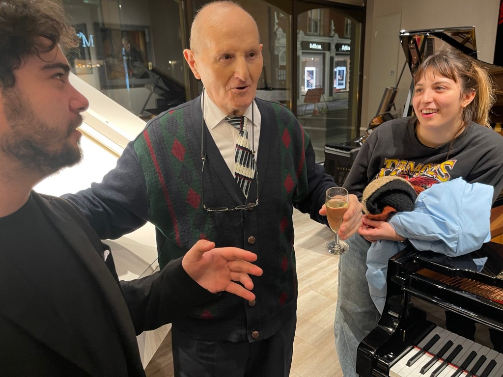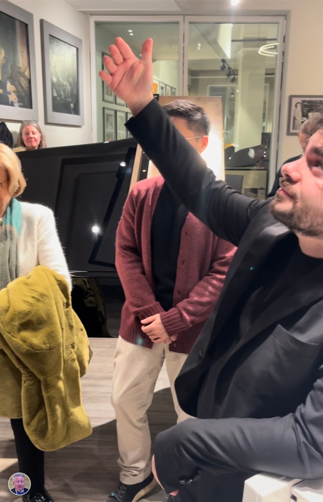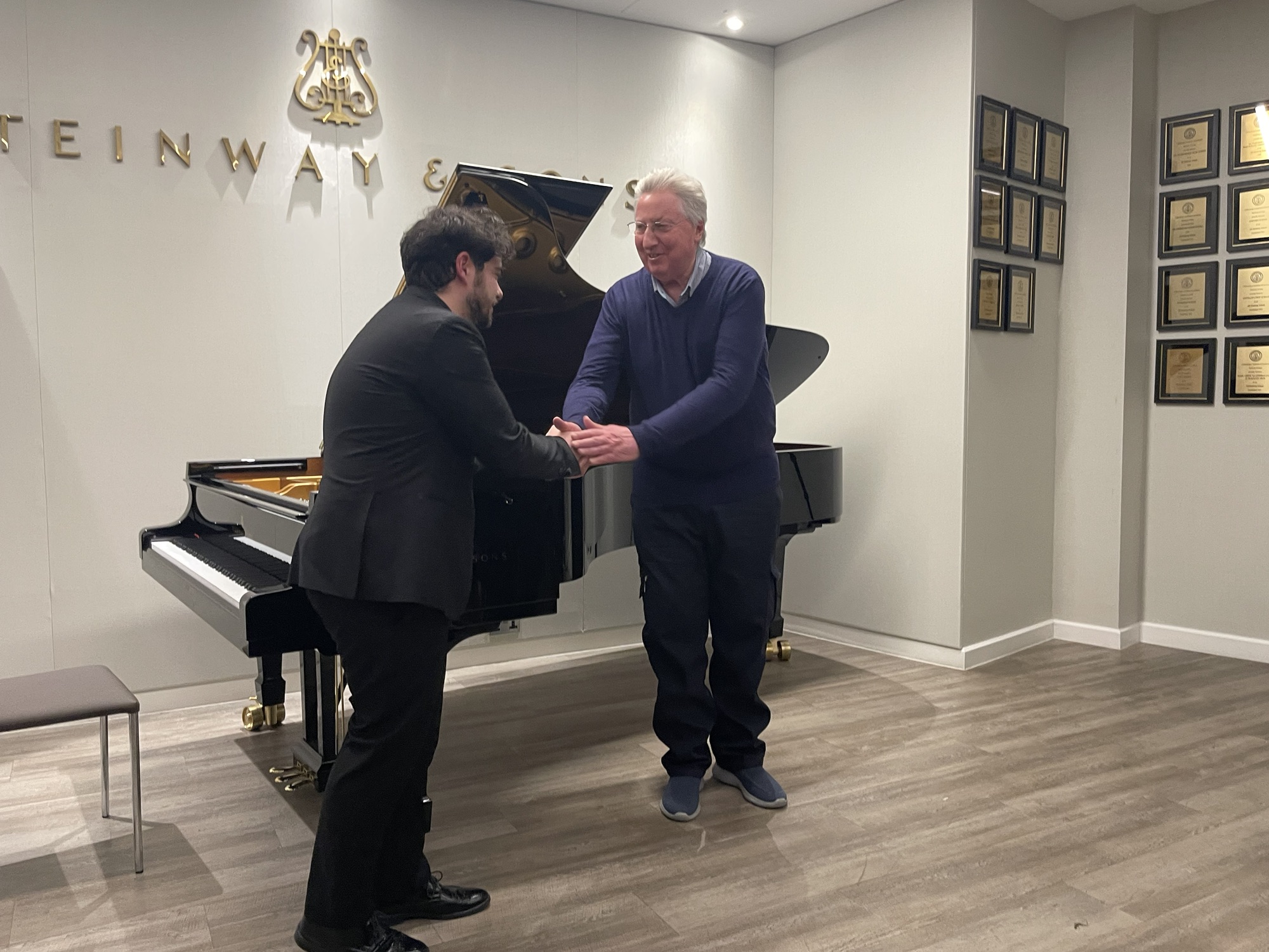 A magnificent Steinway Concert Grand generously shared with us by Wiebke Greinus of Steinways.It is a piano fit for a hall of a thousand not the actual fifty capacity where the artist has to learn to adapt to the size and listen even more carefully to the sounds .Giuliano did as well as most but there was only one Pressler as Lady Weidenfeld pointed out ! A Kreisleriana that was a continual stream of surprises as Giuliano’s vision was so immediate and overwhelming that one was caught up in his same passionate commitment.Details and finesse can be taught but this passionate dedication is something that is of the chosen few.There were moments of sublime inspiration as well as dramatic dynamism.An irritating lack of detail too that was of no real importance in performances that were shouted from the rooftops with such dedication and overwhelming conviction .An ovation greeted the fourth Moments Musicaux and Giuliano rather embarrassed acknowledged the spontaneous applause and some of us thought that was the end .There were another two – the heartrenching Adagio sostenuto elegie and the even more tumultuous Maestoso.