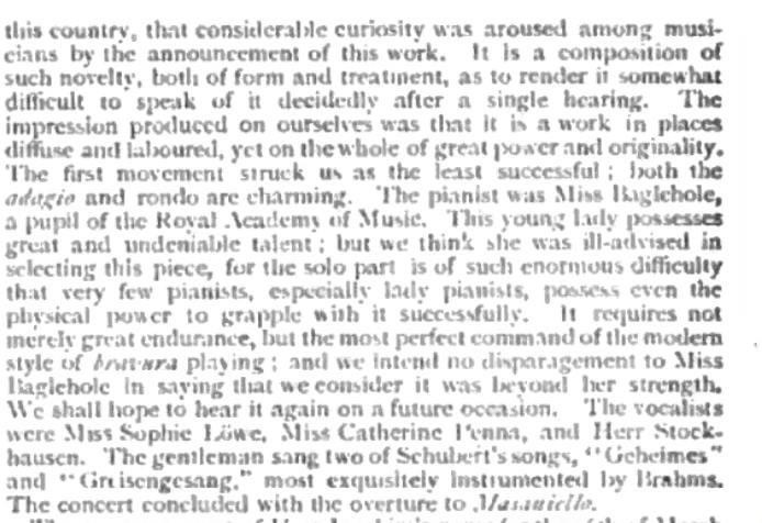 I miss my friend the late Michael Steinberg who was Artistic Advisor to both the San Francisco Symphony and Minnesota Orchestra back in the 80s/90s. He wrote the most wonderful programme notes (many published by OUP) and he was the person who got me to start talking and writing about music. The dearest of friends. Well, I was reading his wonderful note on Brahms’ First Piano Concerto this morning and he mentions that the first performance in England was on March 9, 1872 at Crystal Palace, London, and the pianist was a Miss Baglehole (no joke). I’ve found a review of the concert, an extract of which is below. It’s the usual thing: how a lady can’t play Brahms. So in celebration of International Women’s Day which is tomorrow, I’m posting this and saying that I shall play the Brahms D minor with more balls than a lot of men–believe me!!! And I see we’re performing it on Saturday on the 152nd anniversary of its first performance in England.