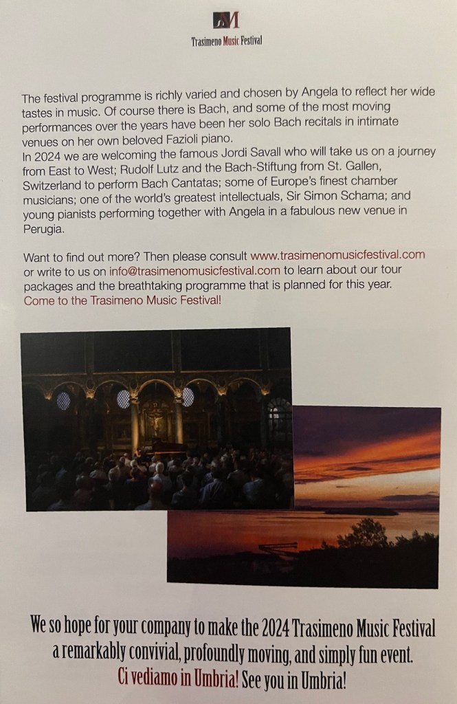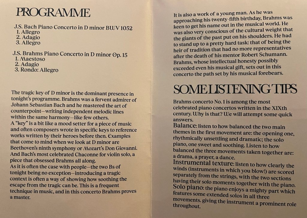 No ‘cuisine’ tonight but two master works by Bach and Brahms.One conducted by Angela who has played and conducted the Klavier Concerti of Bach with many of the major ensembles worldwide .Her experience and musicianship will be of lasting benefit to these young musicians as making music with a ‘High Priestess’ will remain with them as an informed and unforgettable experience for the rest of their professional careers.Brahms of course requires much larger forces and whilst the strings produced a luscious sometimes ravishing sound the winds and brass will have learnt to listen more closely to the overall line that Raffaello was depicting with his beautifully fluid gestures.It gave us the public,though, a chance to hear a pianist ,who is world renowned for her Bach and classical playing, in a different more Romantic repertoire .We should not forget that her programmes this season have included the Brahms F minor Sonata and Schumann Sonata op. 11 as well as completing her Bach Odyssey in many parts of the globe and final recordings of Beethoven 32 Sonatas and Variations as well as complete Mozart Sonatas .I well remember her performance of the Liszt B minor and Dante Sonatas in Rome ,as well as the Goldberg Variations,of course ,shortly after winning the one and only Glenn Gould Competition in Canada in the 80’s.She has also recorded much of the French repertoire including complete Ravel and also major works by Fauré, Chabrier and Messiaen.