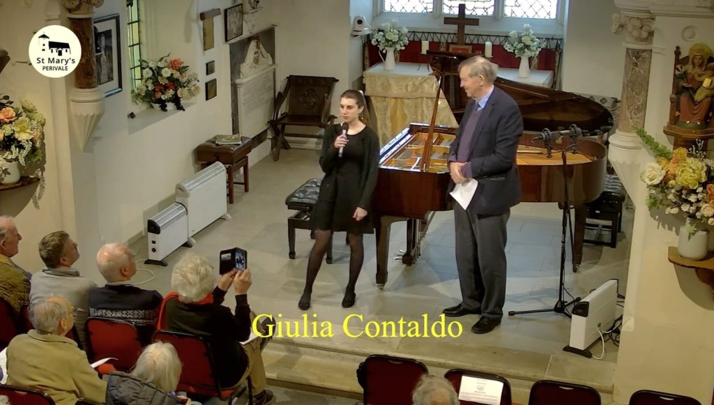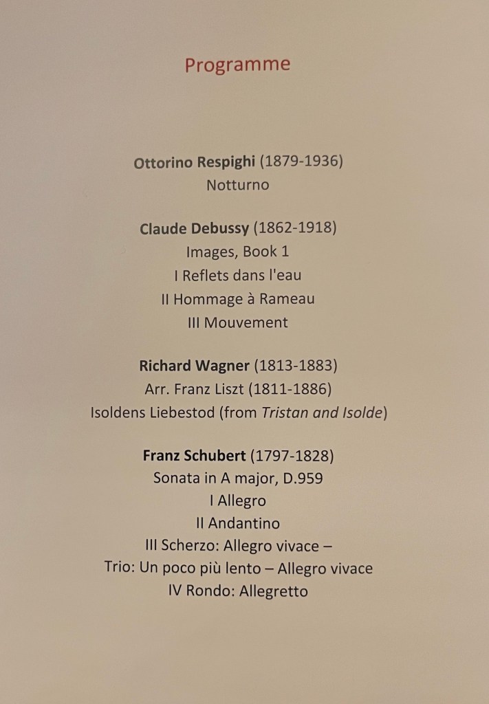 There was absolute clarity to Giulia’s playing with a sense of improvisation as she unwrapped the music before our very eyes and where the music was allowed to flow so naturally as it built up with rhythmic intensity.Some very personal touches too brought the music vividly to life in a true musical conversation .Streams of beautiful seemless scales in the development floated on gently vibrating chords as the music gradually returned to the opening imperious chords.A coda of extreme delicacy where the legato melodic line was accompanied by whispered staccato notes leading to clouds of sounds that brought this movement to a delicate close ready for the poignant simplicity of the Andantino.There was purity and delicacy in the melodic line over the continuous barcarolle like accompaniment .A melodic line of searing intensity as the heart beat so gently underneath.A remarkable control of sound and a masterly control of the pedal that allowed for purity without ever any clouding of the texture .Gradually building up to a storm of truly Beethovenian intensity and drive and a recitativo of heart rending intensity rebuked by the composer with such unusual vehemence until surrendering to the magic return of the main theme.Returning with the most ravishing embellishments and comments that were played with exquisite delicacy revealing an ever more masterly control of sound.She brought sparkling brilliance to the Scherzo and tender refined elegance to the Trio.The ever more delectable return of the Scherzo this time ending with the same finality that owed more to Beethoven than Schubert! The gently flowing Rondo was of subtle shading and beauty as the episodes unfolded with teasing charm and gentle brilliance before burning themselves out.An attempt at restarting the Rondo with Schubert teasingly trying to find a way out which he does with a coda of burning intensity and dynamic brilliance.A final brusque recollection of the Rondo theme leads to the same dramatic opening chords that this time close a story that has spanned all the emotions of the genial invention and mastery of a poet destined to die just a few months later.A performance played by Giulia with mastery and poetry and above all supreme musicianship.