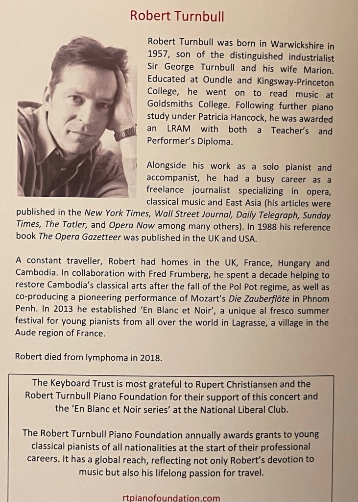 This was the final concert in a series of six recitals sponsored so generously by the Robert Turnbull Piano Foundation in collaboration with the National Liberal Club’s Asia Circle.It had begun with a greeting to the founder of the Keyboard Trust ,John Leech.Unable to attend this evening but who will be 99 years old in a few day’s time and a greeting from us all was recorded and will be shown to him and his wife Noretta Conci on his birthday of Sunday the 21st April.