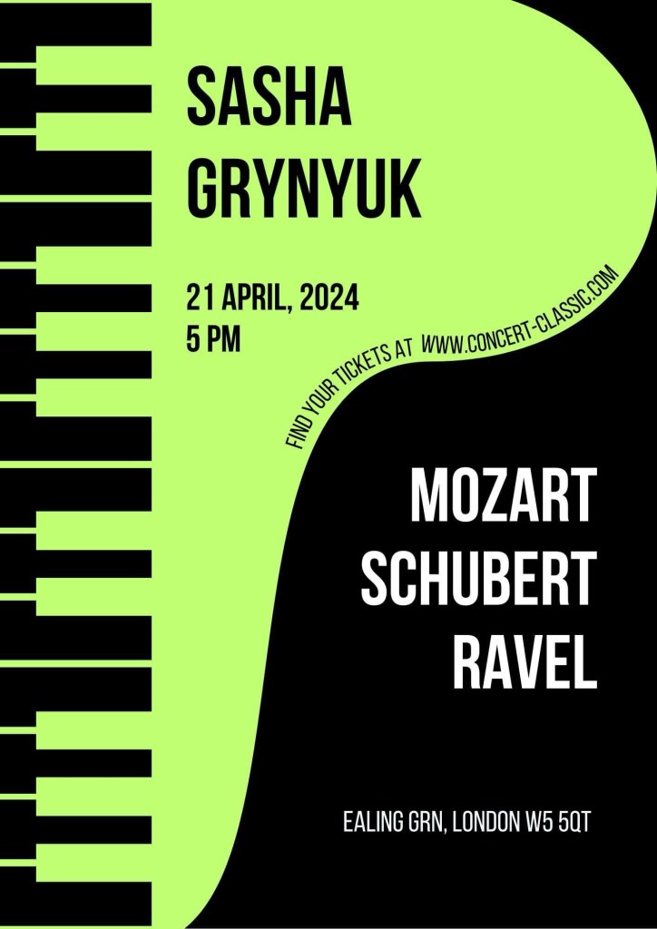 An hour of superb music making this afternoon in Ealing. Sasha Grynyuk playing Mozart Fantasia in C minor with refined poetic insight,a Wanderer fantasy of dynamic drive and architectural understanding but it was Gaspard de la Nuit that astonished for its total mastery and kaleidoscopic sense of colour.