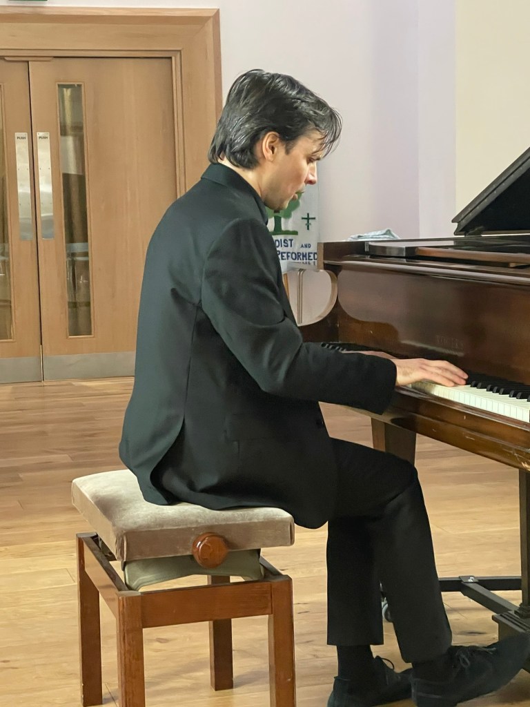 There was an imperious opening to the Fantasia but combined with great tenderness .The startling contrasts were played with disarming simplicity but always with a menacing twist in the tail as this great drama was played out in an absolutely operatic way. In Sasha’s poetic hands one could envisage the drama unfolding as there was an overall sound even where Mozart writes ‘forte’ and then sudden ‘piano’ and the added gasps of ‘fp’ . Sounds that were always in the context of the personages acting on stage and conversing with one another in an age of civilised mutual anticipation.A piano – Rogers – that at first glance one might have thought not possible to bring so vividly to life ,but its almost fortepiano sound lent much to the music like a beautiful but faded photo with its mellow unpercussive sound.