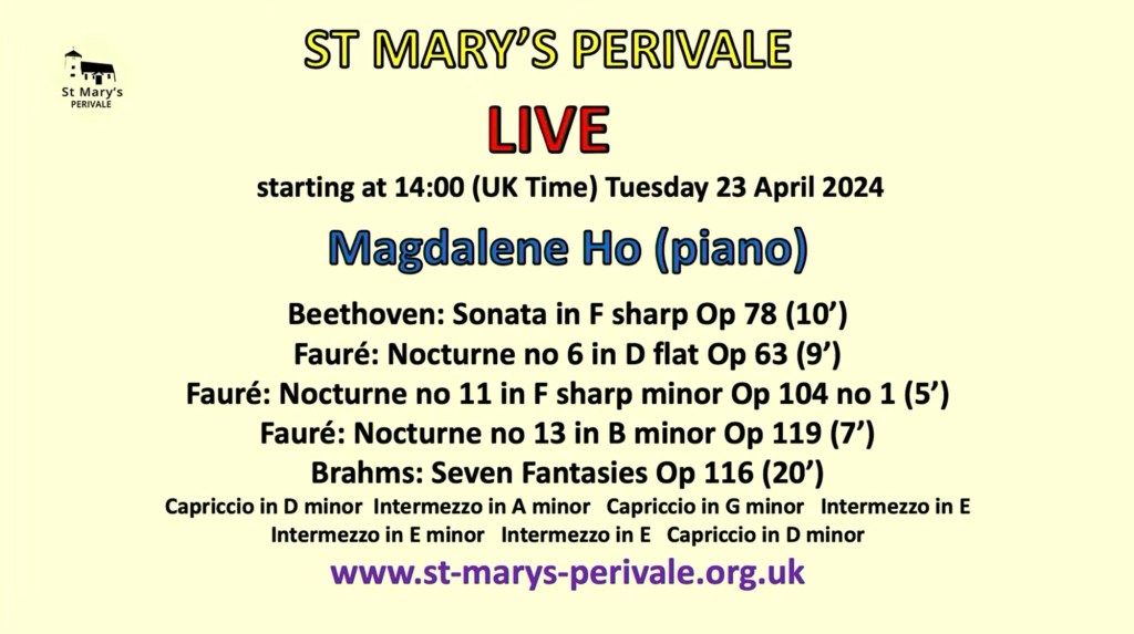 It was a secret world that Magdalene had found the key to as she immersed herself in sounds that enveloped all she did in this short but very intense recital.Almost not wishing to acknowledge the applause after each piece as she was intent on creating an intimate and deep contemplation where there was just her and the music,nothing else existed.The Beethoven Sonata was played with scrupulous attention to the composers very precise instructions.Rests that became as poignant as the meaning she gave to the beautifully shaped phrases.There was a richness to the chords too which contrasted so well with Beethoven’s continuous questions and answers. There was even more luminosity to the melodic line on its return and it with typical Beethovenian impatience that she attacked the ‘Allegro vivace’ that follows. Once again her scrupulous attention to detail and Beethoven’s very precise pedal instructions gave overwhelming authority to this rather capricious movement.The suddenly legato chords of the coda brought a calming spirit to Beethoven’s whimsy and the two beautifully placed chords ‘piano’ and ‘pianissimo’ made Beethoven’s impatience even more of a surprise as with a flourish we were swept away to the final brilliance of the ending.