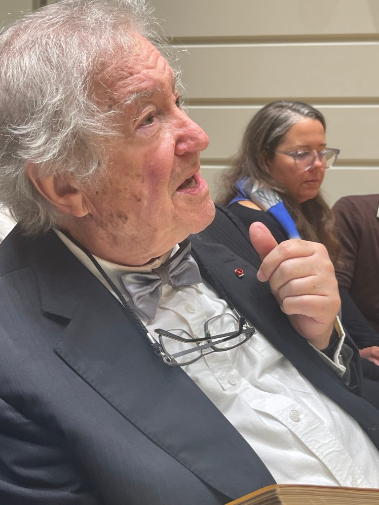 There was an unusual grandiosity and nobility to the Haydn Sonata in E minor played with bold tone and dynamic rhythmic drive.Crystal clear with phrases shaped like a singer but always scrupulously in style with the times.There were great contrasts too in the development .Robust orchestral ‘forte’ , old school one might say but only because we are used to a more polite Haydn of pallid authenticy! Here there was a rhythmic drive where even the ornaments were like springs unwinding with sparkling brilliance but always within the musical line and conversation that we were overhearing.The music ‘spoke’ with a directness and one phrase answered the other.Even Haydn’s surprise ending was indeed a surprise but revealed a control of sound as the last three notes had different inflections on each. Art that conceals Art indeed . There was an operatic unfolding of the Adagio but perfectly proportioned where the music was played with nobility but also the simplicity and originality of Haydn’s genial invention.’Vivace molto’ the last movement certainly was and as Haydn asks an innocent tongue in cheek sense of humour of charm ,grace and wit. A wonderful sense of balance too where the melodic line had a purity and sense of projection without any exaggeration.The teasing embellishements were played without ever disturbing the relentless forward movement but were with a scintillating style that brought a smile to our faces so teasingly charmed at 10 in the morning by an 88 year old veteran .The 20 year old students were probably still in bed !