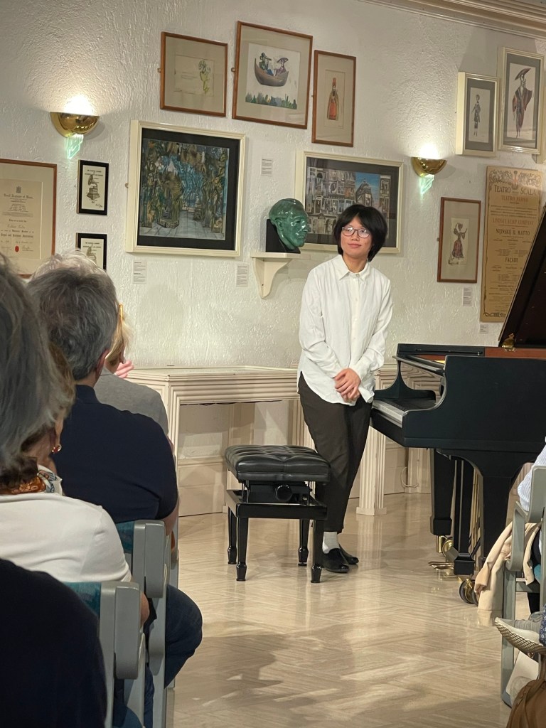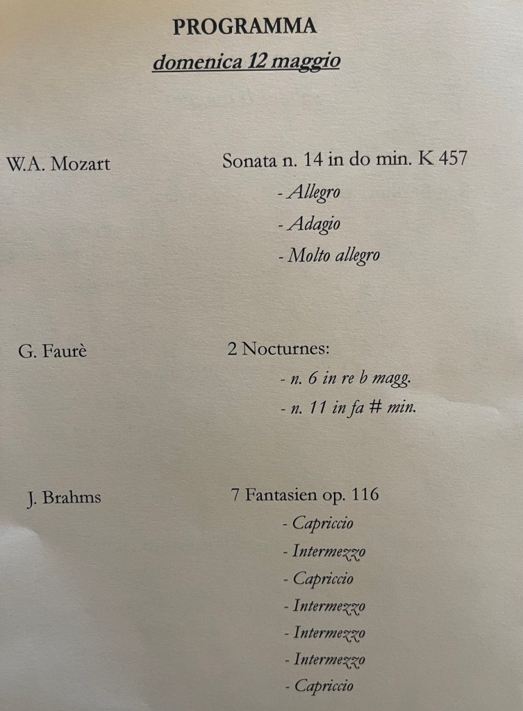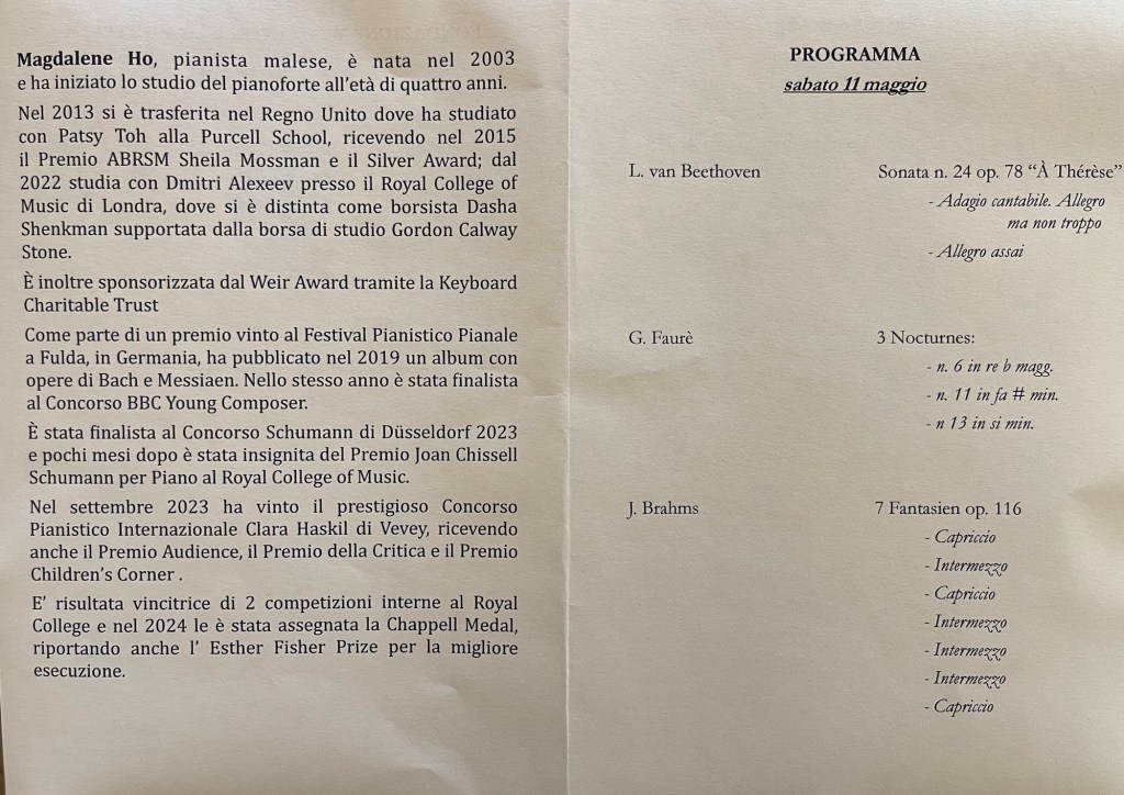 Magdalene who in these days has been playing Chopin’s first piano concert in Switzerland and a recital in Trieste had not thought that she might have been asked for an encore. An encore was demanded by an audience who had no intention of letting this young genius go so easily. The Tarantella ,the last of Liszt’s Venezia e Napoli suite of three pieces, was the answer and it was a breathtaking example of virtuosity and style. If the beautiful central Neapolitan song was a little slow it was because she too was enjoying the sunlight that suddenly was shining brightly after Brahms’s deep brooding and introspection. A work that her former teacher Patsy Fou ( the widow of the great Chinese pianist Fou Ts’Ong) told me that she had not played since she was 12 !