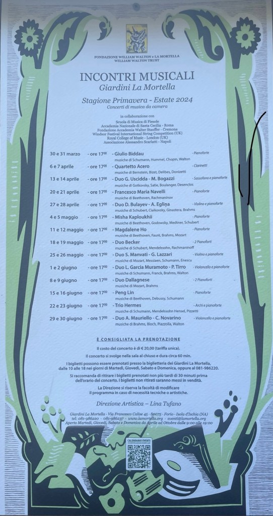 Having recently won one of the two top prizes at the Royal College of Music in London together with Misha Kaploukhii, the artistic director of La Mortella ,Lina Tufano immediately invited them both to play in this paradise of music and nature that was an oasis for the Waltons whose express wish was to give a platform to talented young musicians at the start of their careers.