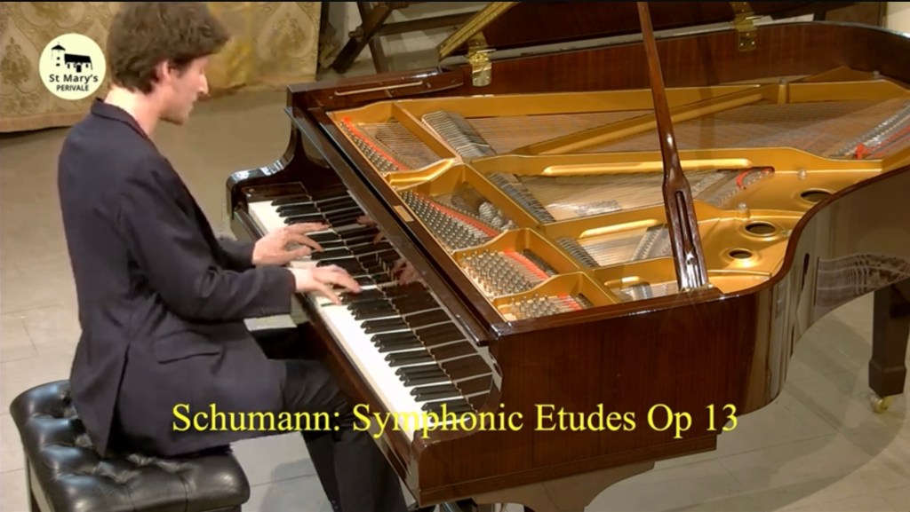 The Symphonic Studies Op. 13, began in 1834 as a theme and sixteen variations on a theme by Baron von Fricken, plus a further variation on an entirely different theme by Heinrich Marschner.The first edition in 1837 carried an annotation that the tune was “the composition of an amateur”: this referred to the origin of the theme, which had been sent to Schumann by Baron von Fricken, guardian of Ernestine von Fricken, the Estrella of his Carnaval op. 9. The baron, an amateur musician, had used the melody in a Theme with Variations for flute. Schumann had been engaged to Ernestine in 1834, only to break abruptly with her the year after. An autobiographical element is thus interwoven in the genesis of the Études symphoniques (as in that of many other works of Schumann’s).Of the sixteen variations Schumann composed on Fricken’s theme, only eleven were published by him. (An early version, completed between 1834 and January 1835, contained twelve movements). The final, twelfth, published étude was a variation on the theme from the Romance Du stolzes England freue dich(Proud England, rejoice!), from Heinrich Marschner’s opera Der Templer und die Judin based on Sir Walter Scott’s Ivanhoe (as a tribute to Schumann’s English friend, William Sterndale Bennett to whom it is dedicated )The earlier Fricken theme occasionally appears briefly during this étude. The work was first published in 1837 as XII Études Symphoniques. Only nine of the twelve études were specifically designated as variations. The entire work was dedicated to Schumann’s English friend, the pianist and composer, and Bennett played the piece frequently in England to great acclaim, but Schumann thought it was unsuitable for public performance and advised his wife Clara not to play it.The highly virtuosic demands of the piano writing are frequently aimed not merely at effect but at clarification of the polyphonic complexity and at delving more deeply into keyboard experimentation.