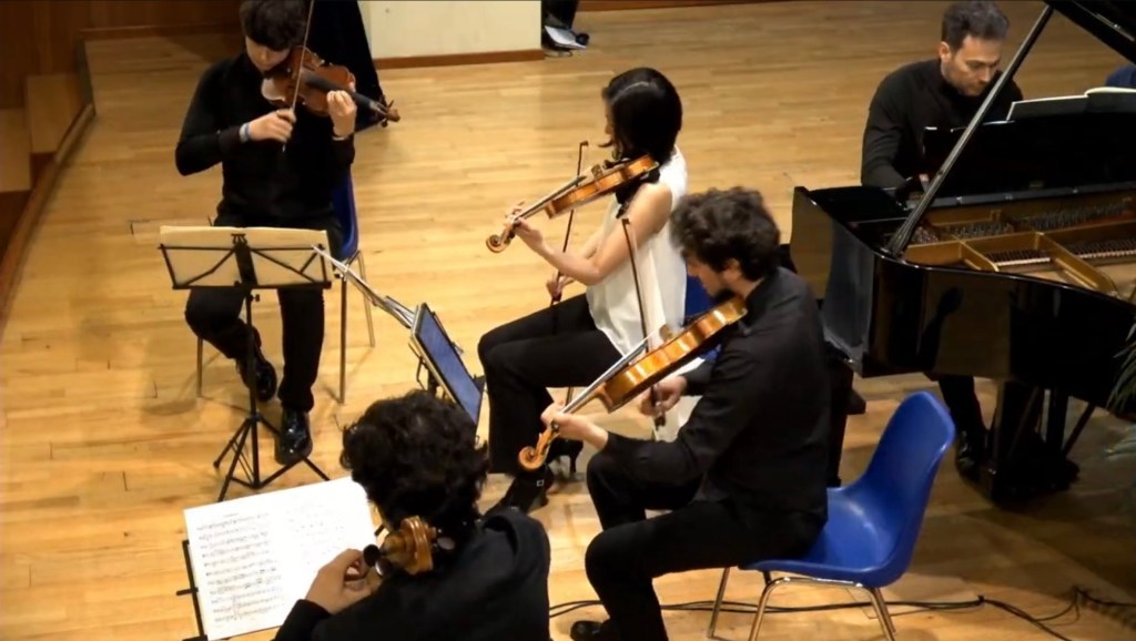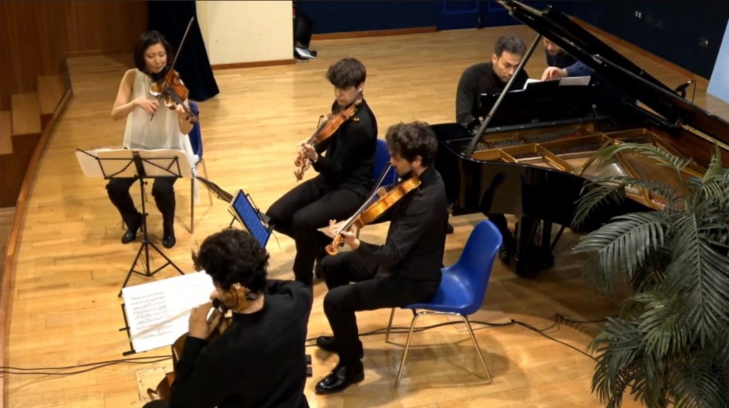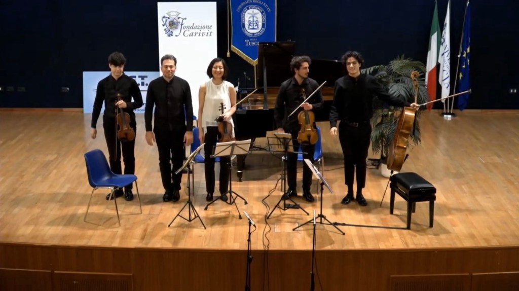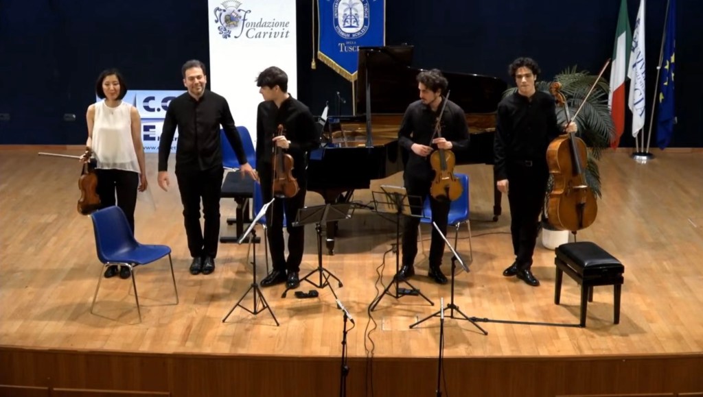 Mirei Yamada and Matteo Morbidelli on the violins swapping places for the two quintets. Matteo Introna and Alessandro Sacchetti,viola and cello,having a special voice in the Korngold where they produced a radiance of sound of Philadelphian proportions.This rarely played Quintet by Korngold started with an explosion of sounds with glissandi on the piano and many other effects of Hollywoodian style but always of expert craftsmanship.The slow movement was a meditative outpouring on the viola and cello joined by the violins in a ravishingly beautiful dialogue with gently throbbing unearthly sounds from the piano.There was a dramatic opening to the last movement leaving just a solo violin soon to be joined by her colleagues for a very exciting and quixotic ending.