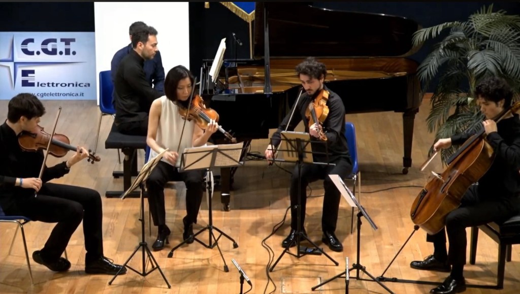 A quintet of players of refined good taste and musicianship.With the piano lid fully opened but never overpowering the quartet of strings as they created together an amalgam of rich beautiful sounds .Massimo Spada was at the helm with some ravishing sounds of delicacy and passion.Glissandi that were streams of colour that just illuminated and added an extra colour to the strings.