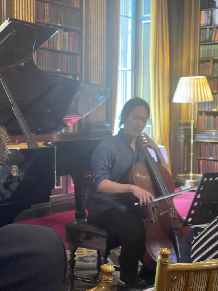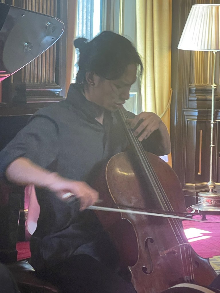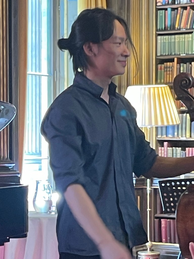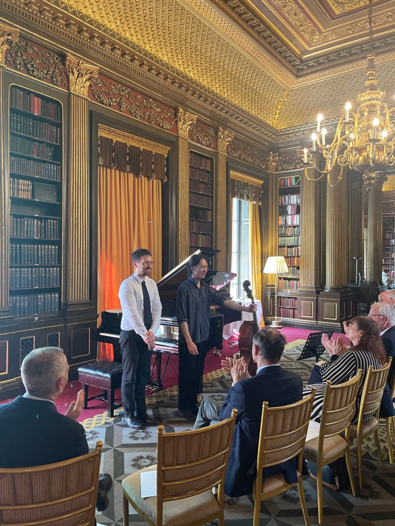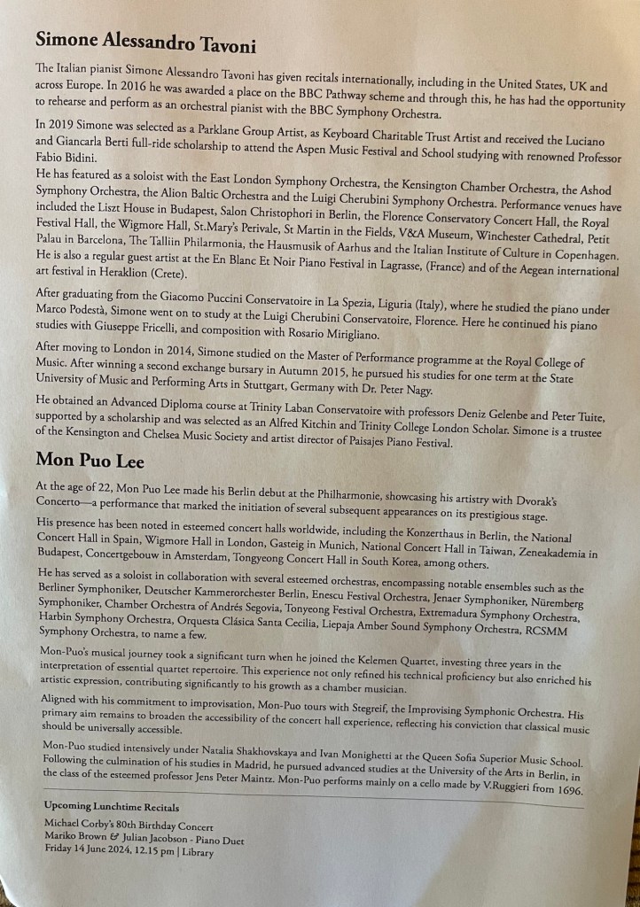 But it was in the Brahms F major Sonata that the two combined to produce a passionate and intense outpouring of orchestral sounds .A real dialogue between ‘cello and piano .Simone never overpowering even with the piano lid fully opened, and as Graham Johnson once quipped, it works because he knows how to drive! The cellist was enjoying too the open lid that could amalgamate and reflect their masterly playing into one unified whole directed at us the lucky recipients of such a feast.There was passion with the opening but also moments of sublime beauty and stillness as piano chords are placed over a mysterious vibrating bass creating an etherial world before unleashing the opening passion once more.There was an intensity and poignant beauty in the ‘Adagio affettuoso’ as the music was allowed to unfold with disarming simplicity in a dialogue between these two sensitive artists.Simone had his work cut out on the ‘Allegro passionato’ and rose heroically to the challenge as the music gathered ever more momentum only to expand into the trio of gloriously rich full sounds.There was a beautiful pastoral simplicity to the ‘ Allegro molto’ finale with its continual stream of notes passing so naturally from the ‘cello to the piano in a true dialogue between two such extraordinary artists.With the smell of the sumptuous cuisine from the restaurant wafting up to the library and was the sign to finish this ‘lunchtime’ concert with no time left for more on this occasion.