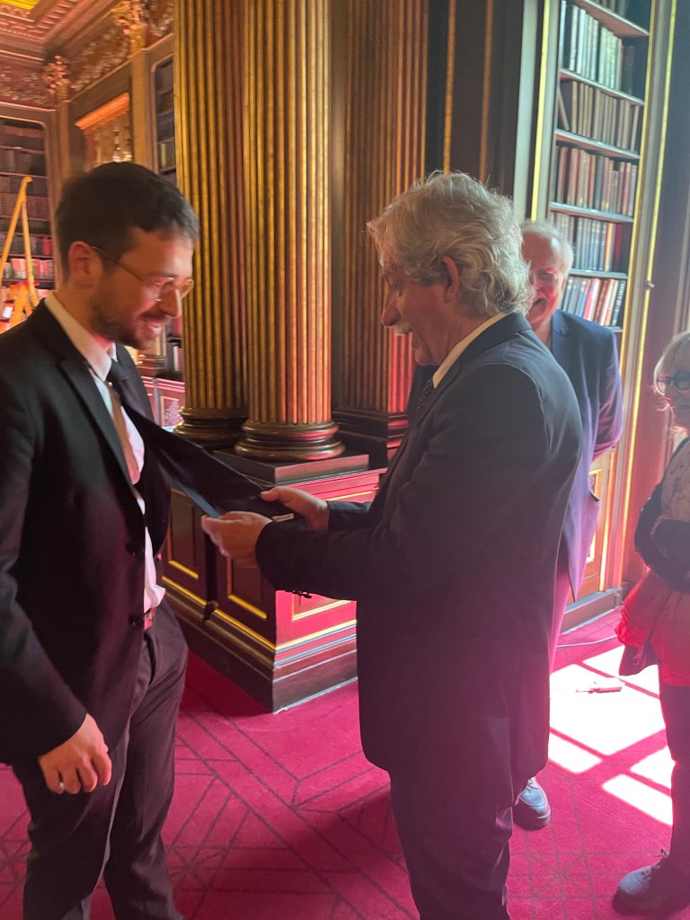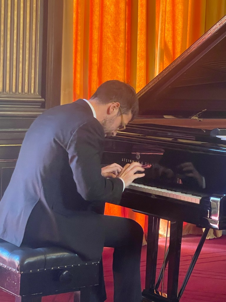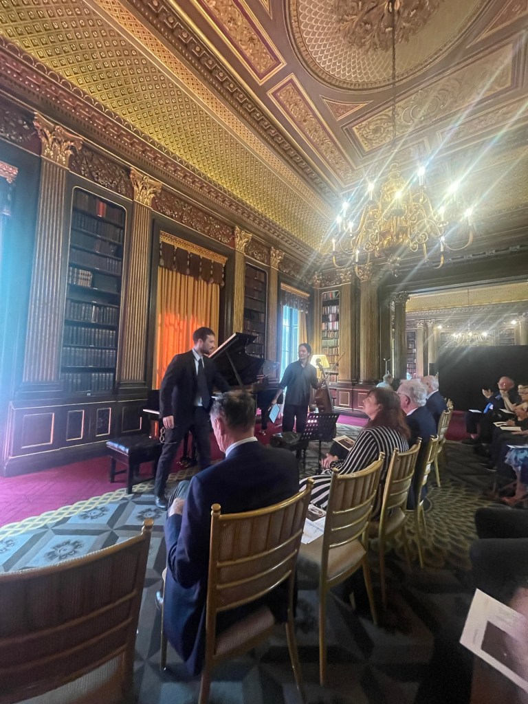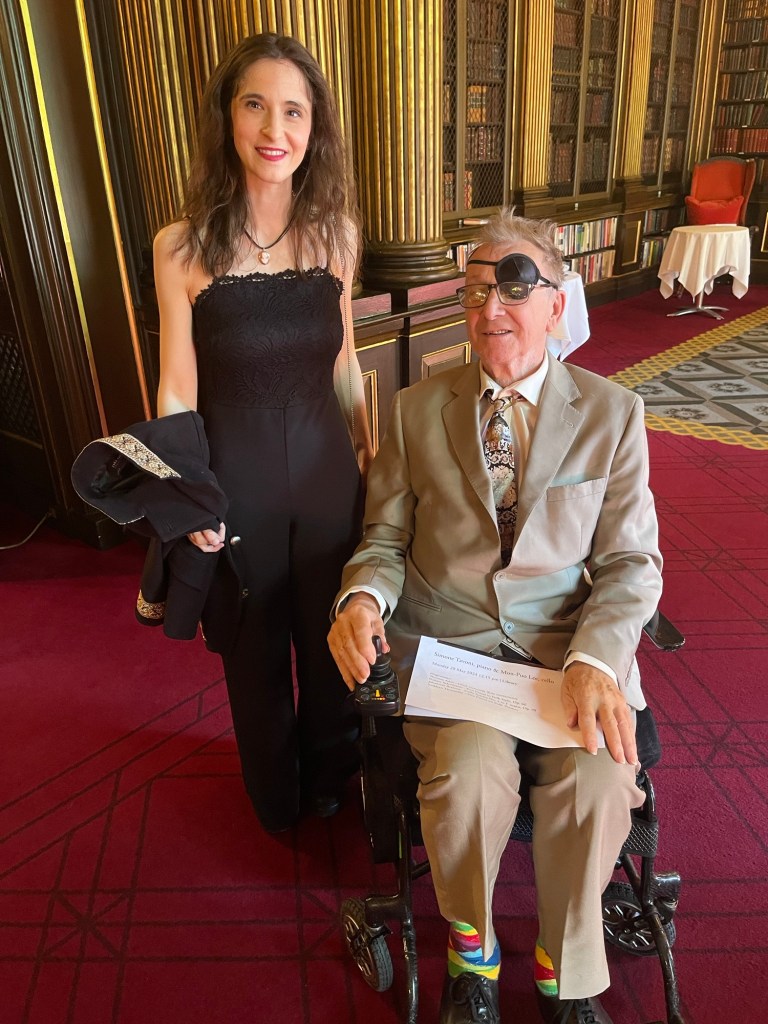 But it was in the Brahms F major Sonata that the two combined to produce a passionate and intense outpouring of orchestral sounds .A real dialogue between ‘cello and piano .Simone never overpowering even with the piano lid fully opened, and as Graham Johnson once quipped, it works because he knows how to drive! The cellist was enjoying too the open lid that could amalgamate and reflect their masterly playing into one unified whole directed at us the lucky recipients of such a feast.There was passion with the opening but also moments of sublime beauty and stillness as piano chords are placed over a mysterious vibrating bass creating an etherial world before unleashing the opening passion once more.There was an intensity and poignant beauty in the ‘Adagio affettuoso’ as the music was allowed to unfold with disarming simplicity in a dialogue between these two sensitive artists.Simone had his work cut out on the ‘Allegro passionato’ and rose heroically to the challenge as the music gathered ever more momentum only to expand into the trio of gloriously rich full sounds.There was a beautiful pastoral simplicity to the ‘ Allegro molto’ finale with its continual stream of notes passing so naturally from the ‘cello to the piano in a true dialogue between two such extraordinary artists.With the smell of the sumptuous cuisine from the restaurant wafting up to the library and was the sign to finish this ‘lunchtime’ concert with no time left for more on this occasion.