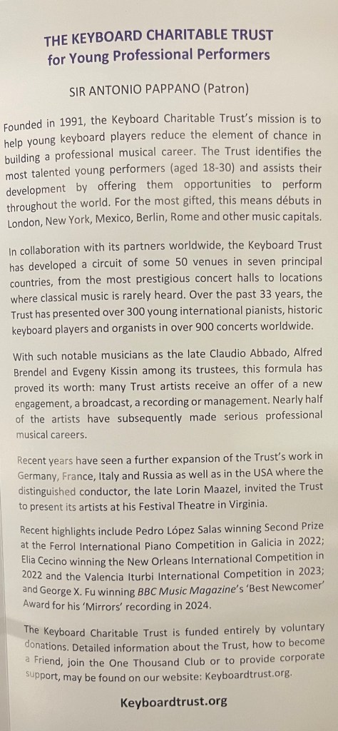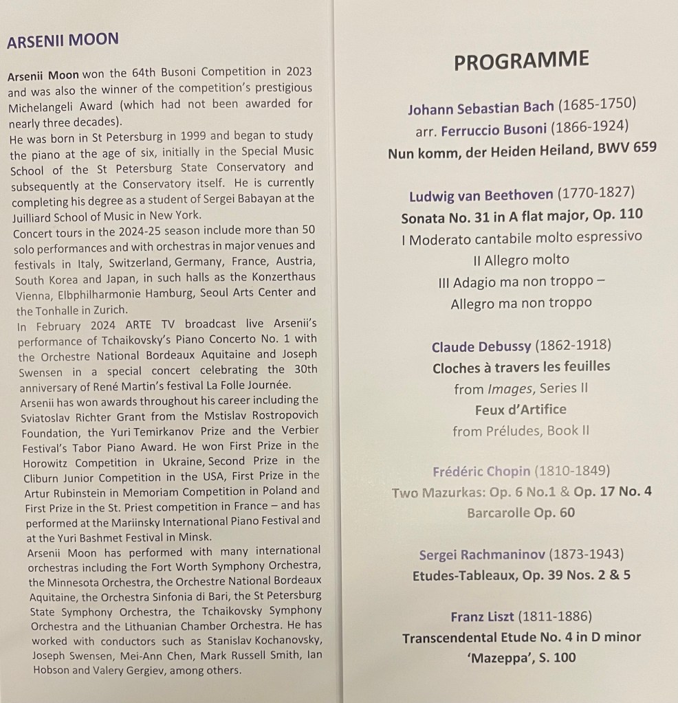 Three preludes by Respighi played with crystal clarity, purity and the grace and ease that he brought to all he did .Mozart was beautifully shaped with simple elegance and brilliance and well oiled fingers that shaped all they touched with eloquent musicianship.If the Liszt Ballade lacked a great architectural shape it gained from being played with such clarity and beauty A fearless technical mastery as the tempest of Hero and Leander played itself out in Liszt’s great tone poem of such a sad tale.Bacewicz I have only once heard before and it is a work as Kerry said touched by the period of war with desolation ,isolation and dynamic drive.