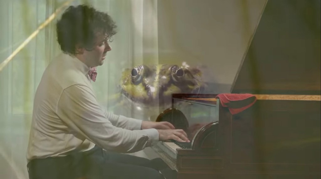 The Barcarolle is one of the greatest of works for the piano where there is a continual outpouring of mellifluous beauty reaching heights of the sublime. There was a beautiful fluidity from the very first notes and it is hardly surprising that the director of photography discreetly showed us the brook that bubbles through Chopin’s garden.There was even a frog looking on with such marvels in his eyes with leaves being reflected in the water.Nothing could deflect from the refined beauty and poetry of the playing though.The overhead camera allowed us to appreciated the delicate continuous circular movement of his left hand as the barcarolle continued on it’s way with ravishing beauty.Sublime heights were reached with Chopin’s indication ‘dolce sfogato’ revealed with playing of rare sensitivy in a passage that Perlemuter would exclaim ‘we have arrived in heaven’. Martin picking up the tempo towards the end that gave great shape of joy and exultation and a point of arrival from which he could dissolve as the music gradually disintegrates with veiled beauty before our astonished eyes.