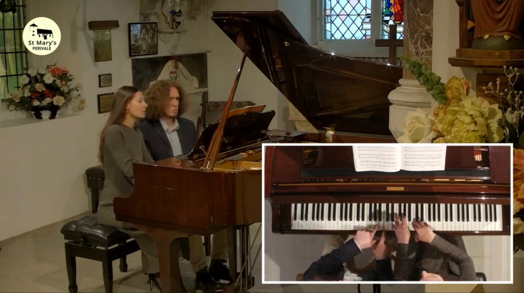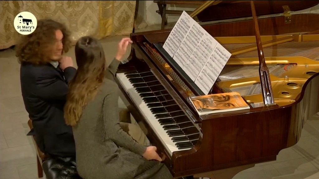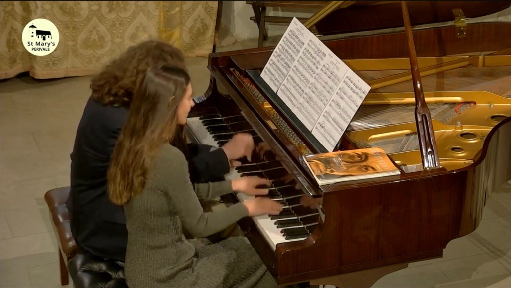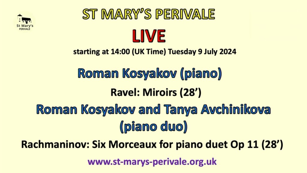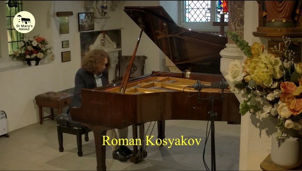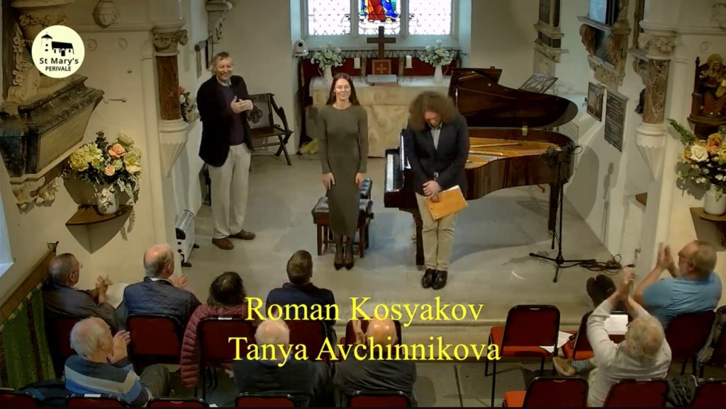 This was the landscape that Roman so nobly depicted in sound today and it was wonderful to meet his wife who is certainly his peer pianistically but had also discovered during the pandemic a talent to paint the sea in pastels as she and her husband were guests in Hastings where Roman had been winner and is now ambassador of their International Piano Competition.Rachmaninov’s beguiling early suite for piano duet op 11 was played by husband and wife with charm,style and not a little Russian nostalgia.And charm there was too in the little encore by Respighi apparently based on Christmas which had Tanya leaping down to the bass to have the last word over her husband.