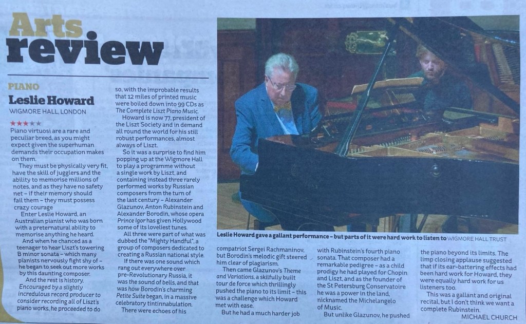 ‘Leslie Howard presented an all-Russian programme this July. Famous for his scholarship and understanding of Liszt, Howard’s love of the Russian composers Glazunov, Borodin and Rubinstein is unsurprising in that they all owe a debt to the Hungarian composer and pianist in one way or another. It was Liszt who took the burgeoning Borodin under his wing and conducted his music whenever he could, and Borodin dedicated his orchestral masterpiece In the Steppes of Central Asia to Liszt; Glazunov visited Liszt in Weimar in 1884 (Liszt arranged for the teenager’s First Symphony to be performed, and the Second Symphony was dedicated to Liszt in gratitude); and although Liszt did not need to help the young Rubinstein in promoting his compositions, the lad had spent much time studying the master’s performance technique and was soon to be celebrated as the greatest pianist after Liszt.’
