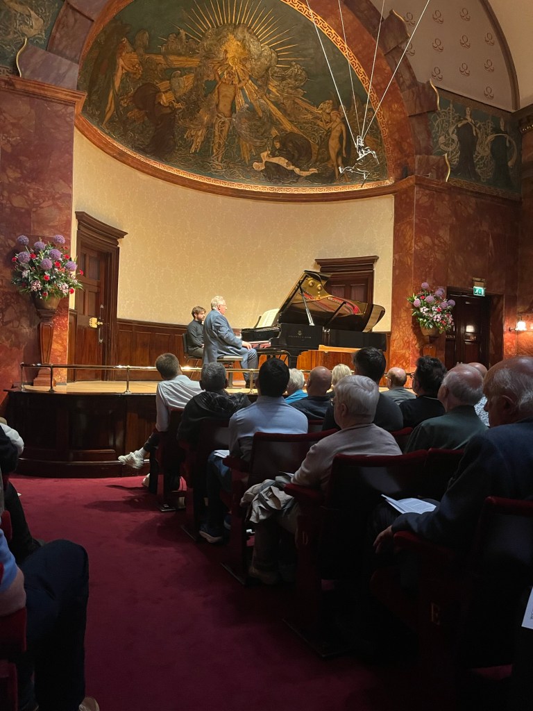 Glazunov’s own Theme and Variations is a large scale work opening with great Russian bells tolling with nobility and creating the atmosphere in which the fifteen variations could evolve.There were etherial sounds of glittering beauty and variations that flowered with sumptuous richness , even a variations that owed much to Brahms.Following on with variations of kaleidoscopic colour and beguiling sounds with streams of notes as the intensity gradually grew.An extraordinary work that Leslie played with an architectural shape and mastery that had us wondering how such an important work could lay hidden from pianists for so long.