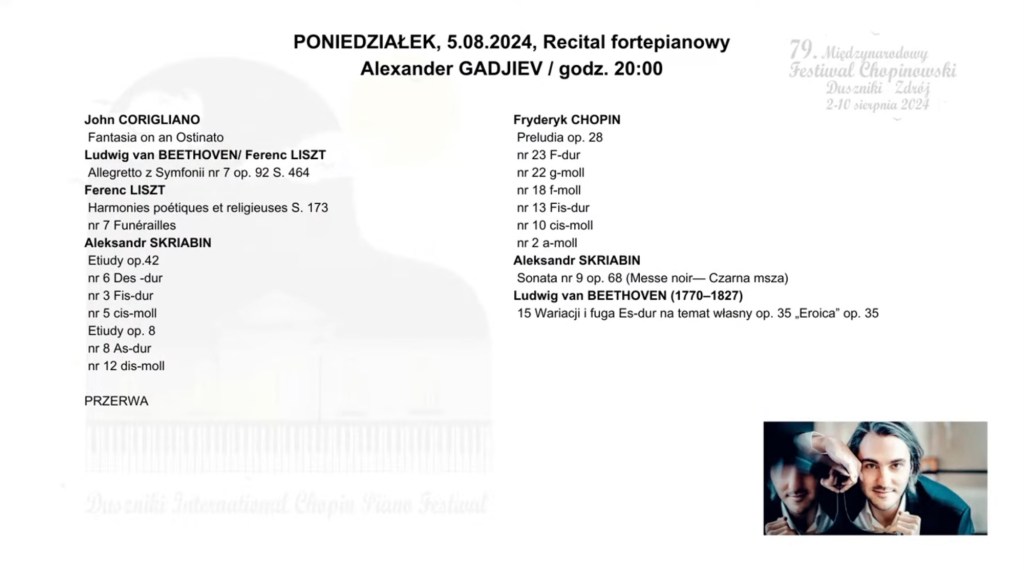 There was nobility and clarity from the very first notes of Mussorgsky’s ‘Pictures’.A remarkable performance in which each picture was described with quite extraordinary conviction and character.From the startling contrasts of ‘Gnomus’ to the continuous heart beat of the ‘Old Castle’ with it’s inner colouring of mystery and luminosity.A hypnotic sense of phrasing where the squabbles in the ‘Tuileries’ were answered by the robust pedalled old cart horse ‘Bydlo’ that disappeared into the distance with masterly control of sound.A mysterious promenade was rudely interrupted by the squarking antics of the unhatched chicks.’Goldberg’ entered with such preposterous importance as poor ‘Schmyle’ was left whimpering in the distance.The ‘Market at Limoges’ has never sounded so busy as in Arsenii’s hands today or the ‘Catacombs’ sounded so imposing with a great sense of line dissolving into glistening sounds of barely whispered reverence.’Baba Yaga’ was surprisingly restrained at the beginning but soon build up energy and fervour in Arsenii’s sumptuous hands.The central episode usually played rather dryly was here played with remarkable colour and beautiful shape.’Baba Yaga’ taking complete control with technical prowess and volume only to be stopped in his tracks by the vision of such imaginary beauty as ‘The Great Gate of Kiev’.A masterly performance as Arsenii’s control of balance and sound allowed the final appearance of the Great Gate to be truly breathtaking in majesty and nobility as we all shared in the magic vibrations that were allowed to resound in the air.A remarkable performance from a supreme stylist and master of sound.