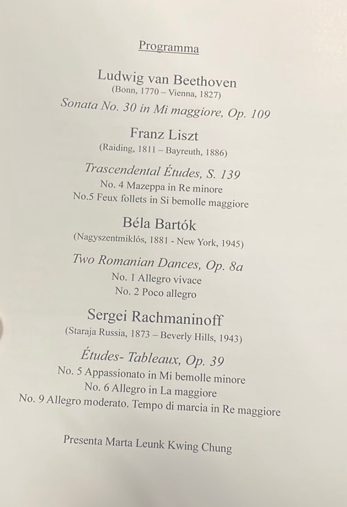 His repertoire was far ranging from Beethoven (Sonata n. 30, op. 109) to Liszt (2 Transcendental Etudes) to Bartok (two rarely performed Romanian Dances) to Rachmaninov (three Etudes -Tableaux). Throughout the whole performance given with the highest professional polish and acumen, Taige revealed new vistas of all these great works. There was nothing distorted or self serving, only the pure joy of making music! To add to the charm, he is a bit devilish and witty at the same time. Adorable! Evviva!’