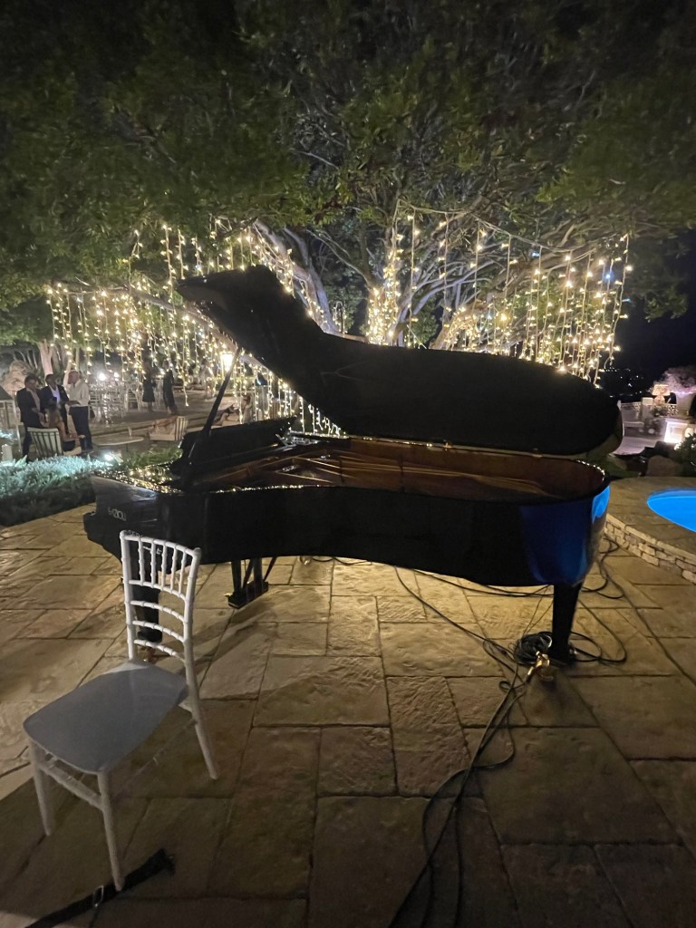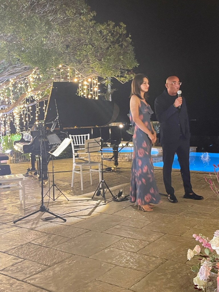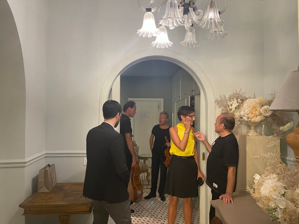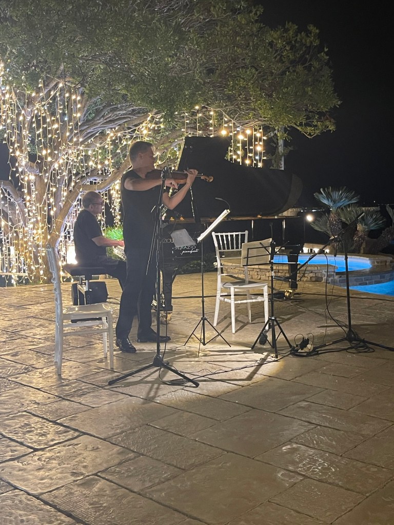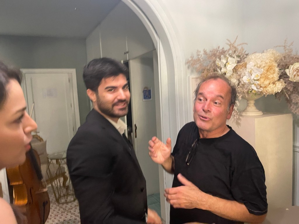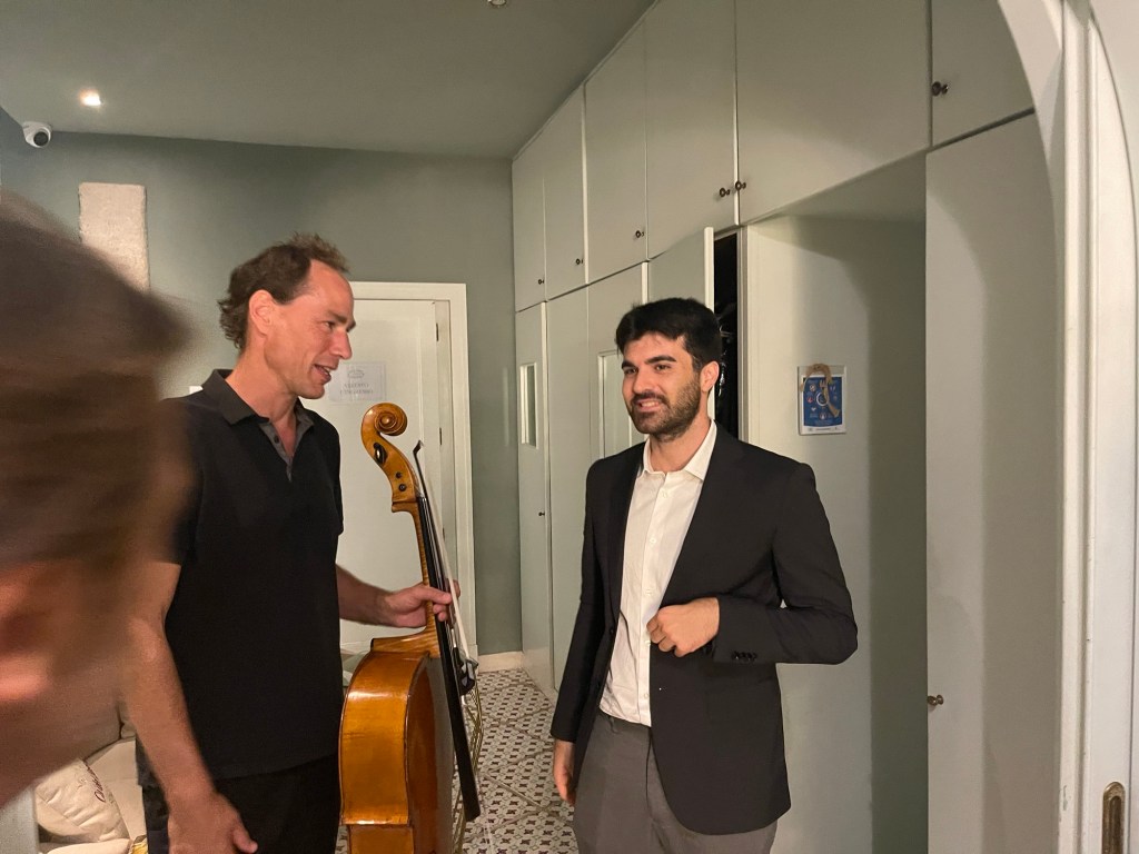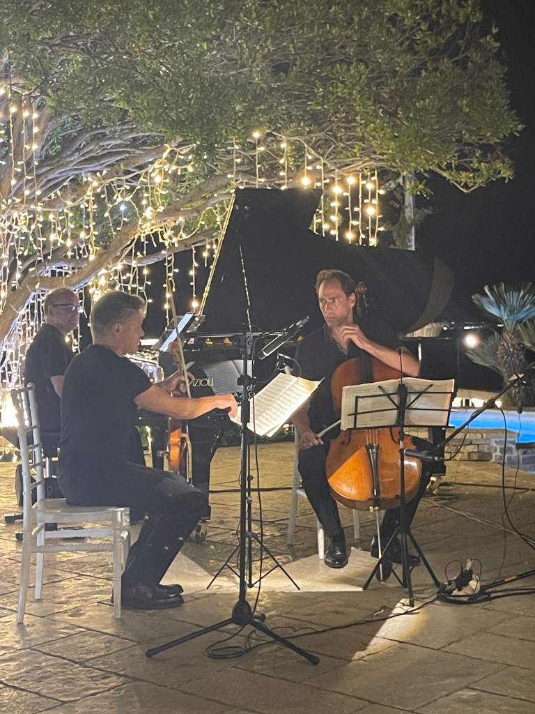 Mozart’s Trio in B flat was played with the charm and grace of it’s time with the violin and piano in a question and answer of simplicity and style.There was exquisite beauty from the piano in the ‘Larghetto’ with the weight of the piano answered by the ravishing beauty of the violin.The cello was a wonderful support always following and sustaining his much busier partners.Coming into his own,though, in Schumann Knut Weber bonded with Louis Lortie in a performance of enticing beauty and passionate sweep.The piano matching the sumptuous richness of the glorious romantic cello sounds.Hahn completed the circle before sitting down to an wonderful culinary feast. Hahn had actually opened the concert with the sounds of almost Hollywoodian fervour from Markus Daunert’s beautiful Gotting violin.Louis providing the suitable cascades of arpeggios on which the meltingly beautiful melodies of Hahn could truly float and fill the rarified air with delicate sentiments of a past age.It is all the idea of a ‘local boy’ :Luigi Carroccia who with his wife are determined to bring great music to this most beautiful part of Italy .