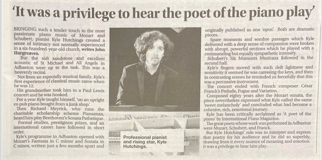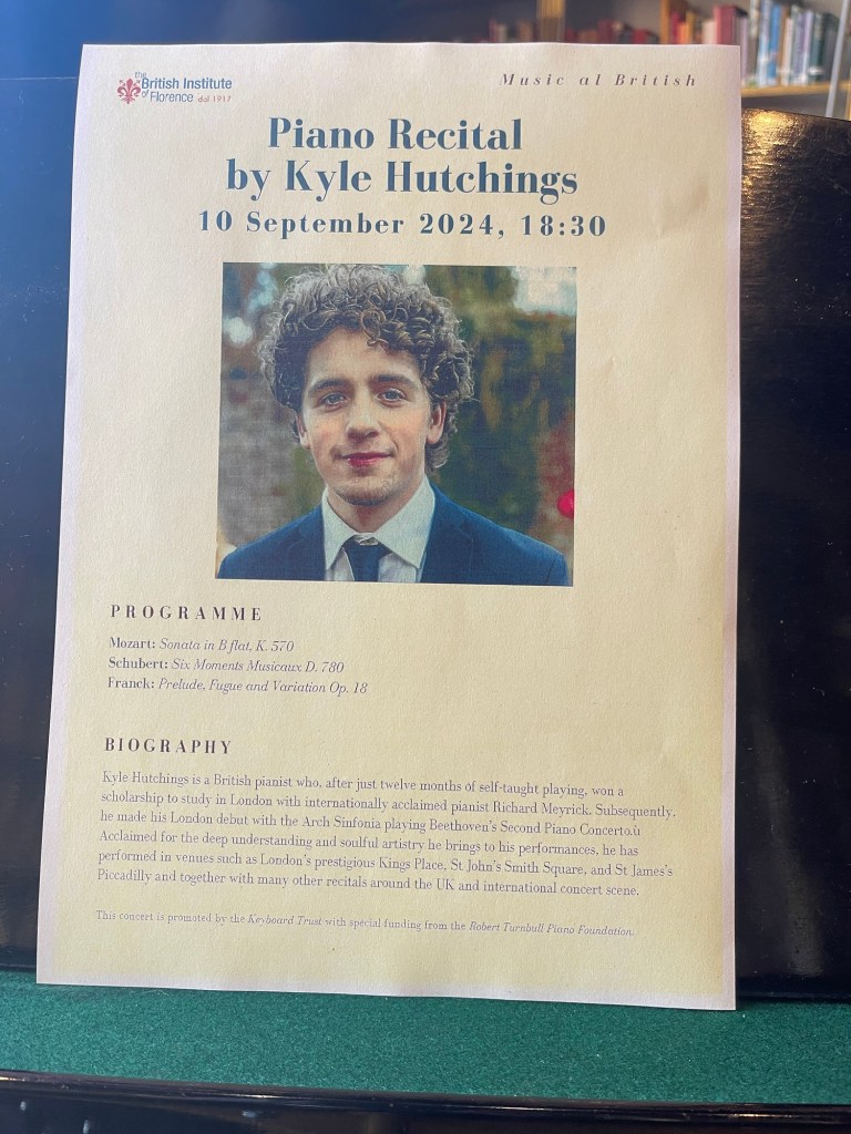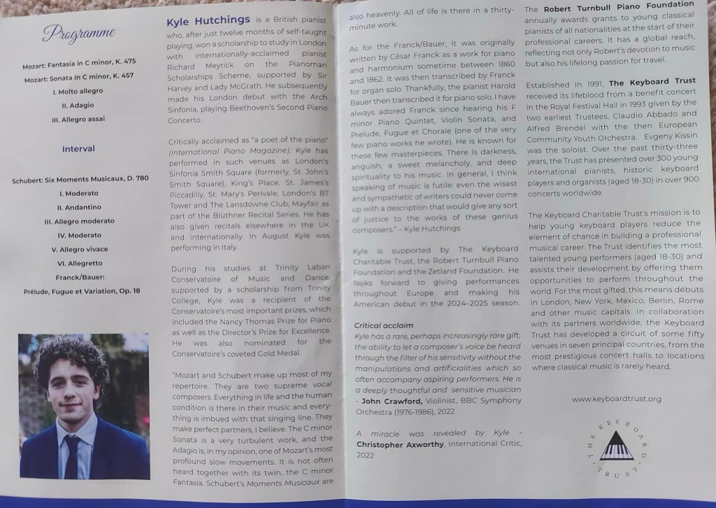 Kyle Hutchings A poetic troubadour of the piano reveals the heart of Mozart,Schubert and Franck the Keyboard Trust Concert Tour of Adbaston ,Ischia,Florence and Milan